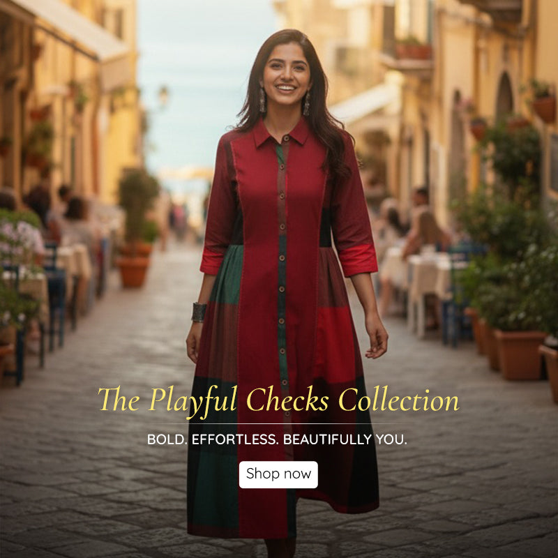 Red-Green Checks Handwoven Gather Dress with Hand Embroidery Detailing