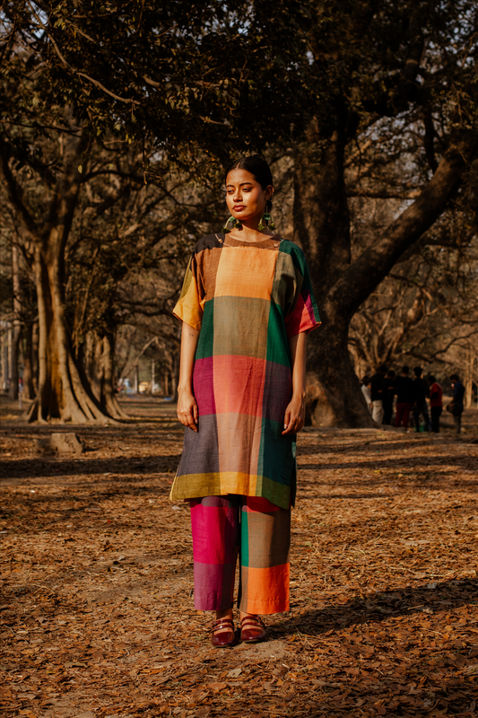 Mustard Multicolour Checks Handloom Cotton Antifit Kurta Set (set of 2)