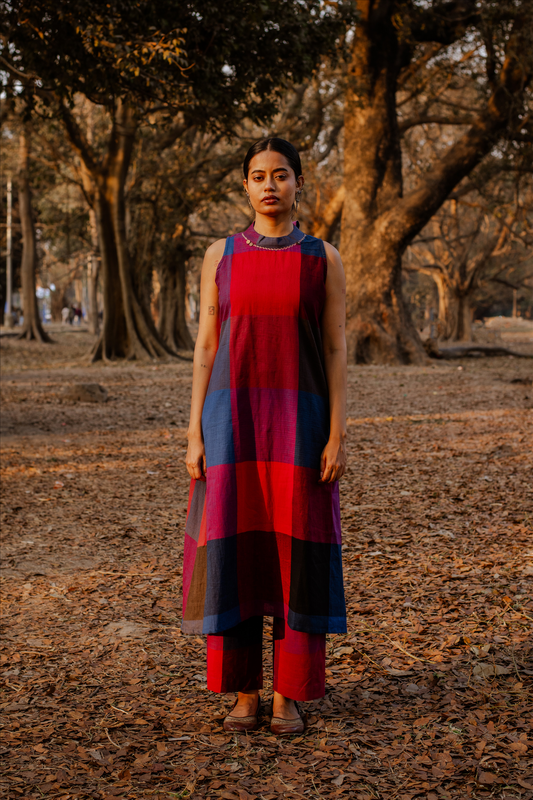 Red Multicoloured Checks Hand Embroidered Handloom Cotton Half & Half Kurta