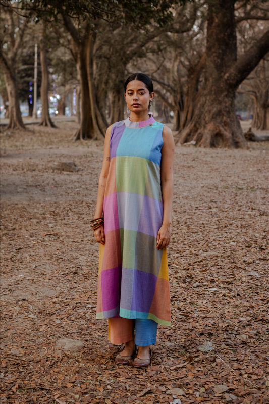 Purple-Blue Pastel Checks Handloom Cotton Halter Neck Dress