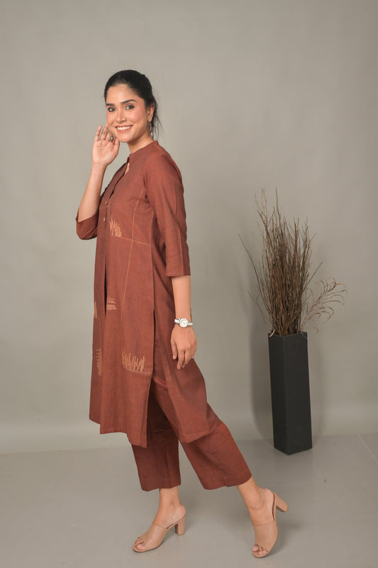 Brown Geometric Hand Embroidered Handloom Cotton Kurta Set (set of 2)