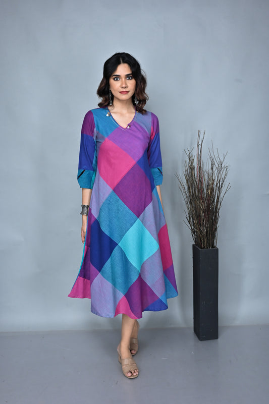 Lime Checks Handloom Cotton Halter Neck Kurta Set with Lime Checks Flared Pants (set of 2)