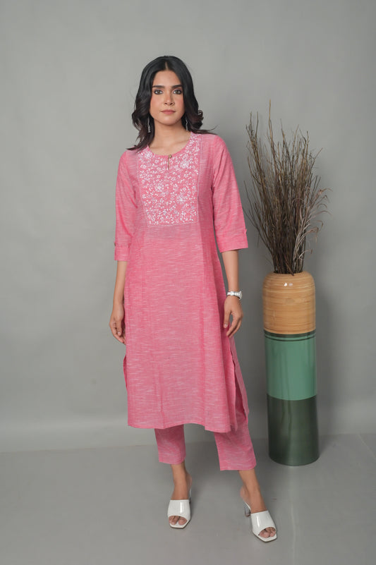 Pink A-Line Kurta with Floral Hand Embroidery Detailing
