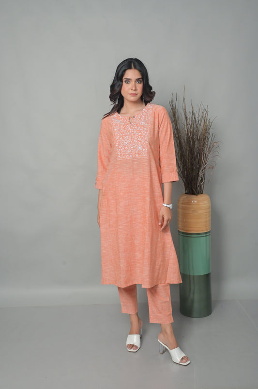 Effortlessly elegant, this coral-toned kurta blends ease with artistry. Cut in a relaxed A-line shape,...