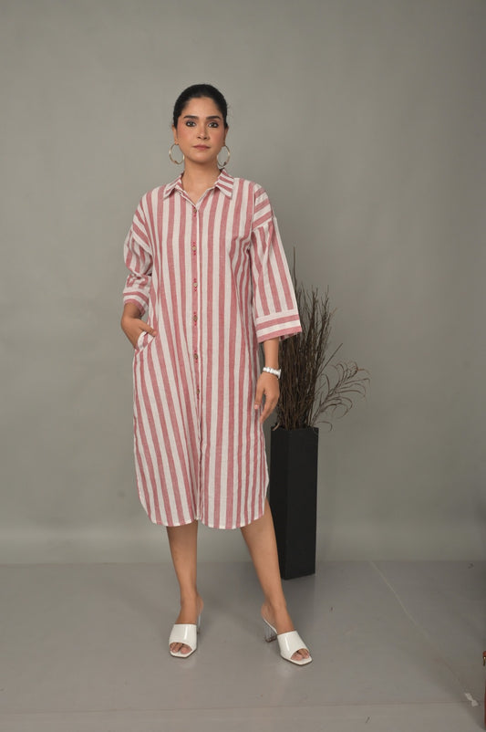 White-Red Stripe Anti-fit Dress with Shirt Collar