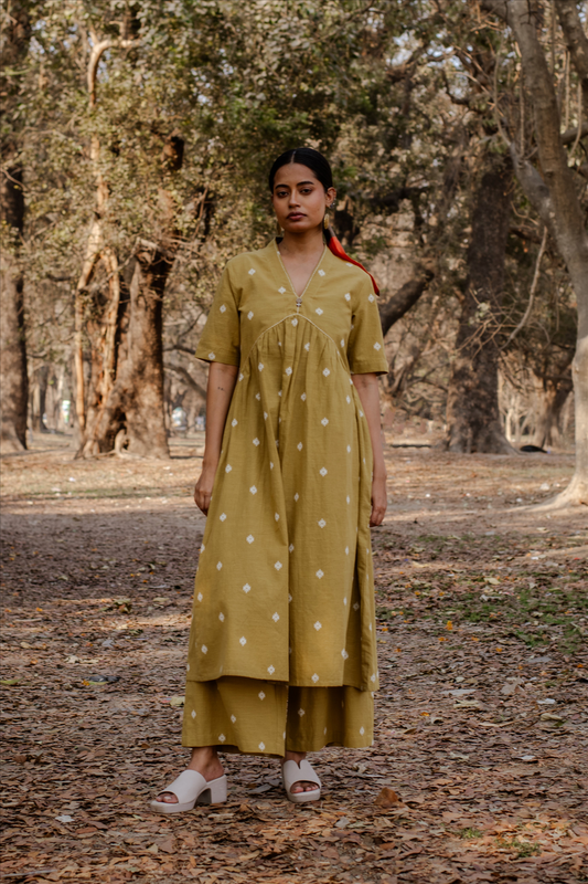 An easy, everyday co-ord set crafted in breathable cotton, featuring an olive green front-open kurta with...