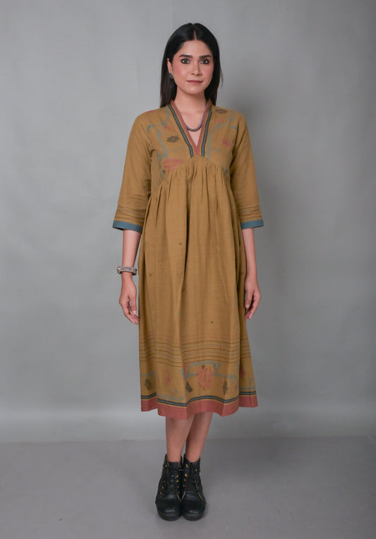 "Elegant Mustard Jamdani A-Line Dress: Lightweight, breathable cotton dress featuring classic Jamdani weaving, tailored in...