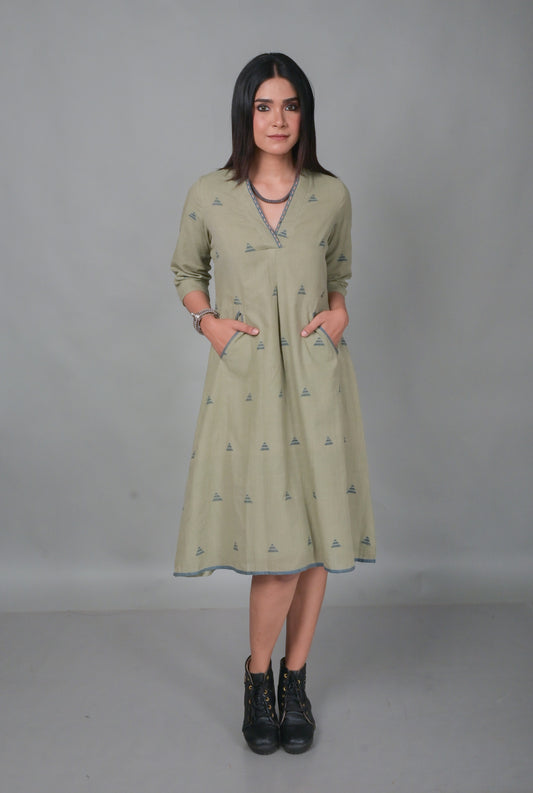 Handwoven OliveΒ Jamdani dress with a soft, airy texture Features Kantha hand embroidery for artisanal detailing...