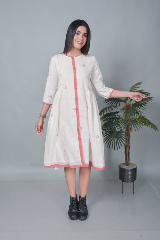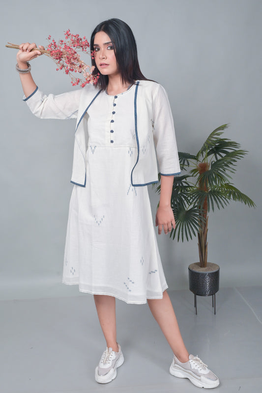 Handwoven WhiteΒ Jamdani dress with a soft, airy texture Features Kantha hand embroidery for artisanal detailing...