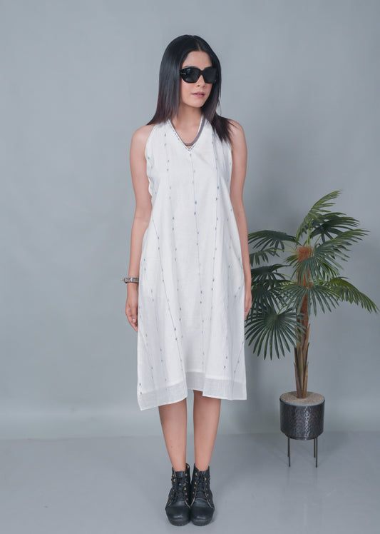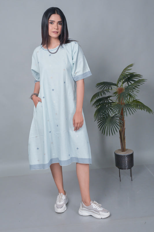Elevate your everyday style with this Light Blue Jamdani Handwoven A-line Bias Dress. Crafted from...