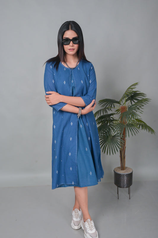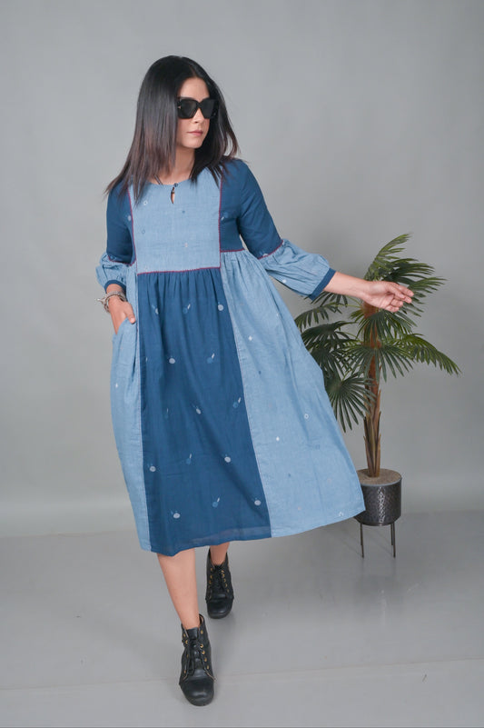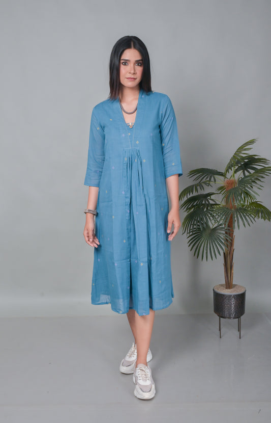 "Elegant Blue Floral Jamdani A-Line Dress: Lightweight, breathable cotton dress featuring classic Jamdani weaving, tailored...