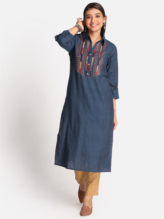 Shop our blue handwoven kurta, showcasing intricate Kantha hand embroidery on the yoke. A blend...