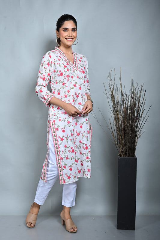 Step into elegance with this White Floral Print Three-Panel Kurta, designed in a flattering A-line...