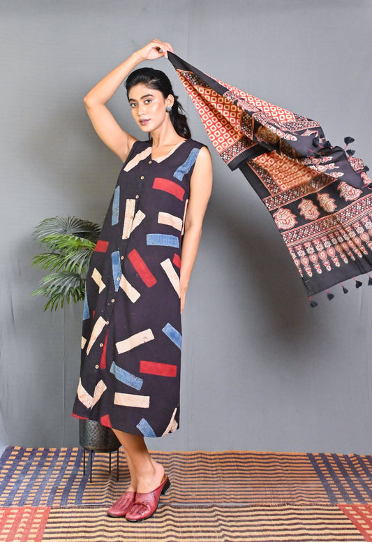 Shop our Black Ajrakh Block Printed Sleeveless Dress, featuring intricate designs and a flattering fit....
