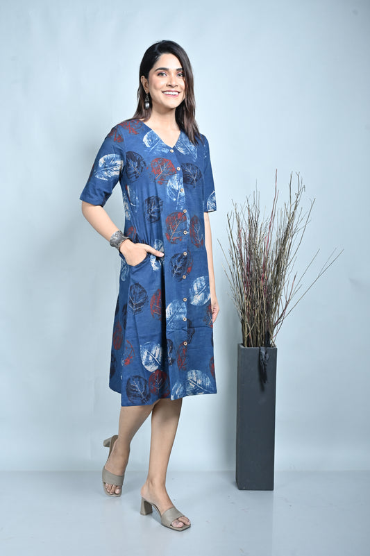 Blue Kettle Block Printed A-Line Zipper Dress with Hand Embroidery on Neck