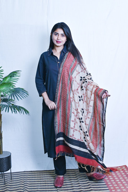 Elevate your style with this Red Ajrakh A-line Dress with Kantha Embroidery, featuring intricate hand-embroidered...