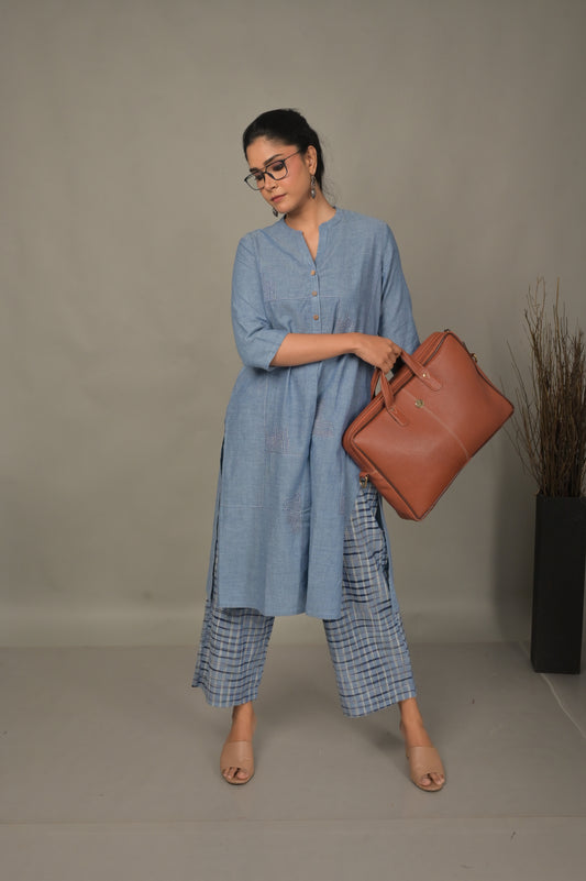 A graceful blue khadi kurta adorned with subtle Geometric hand embroidery, offering a touch of...