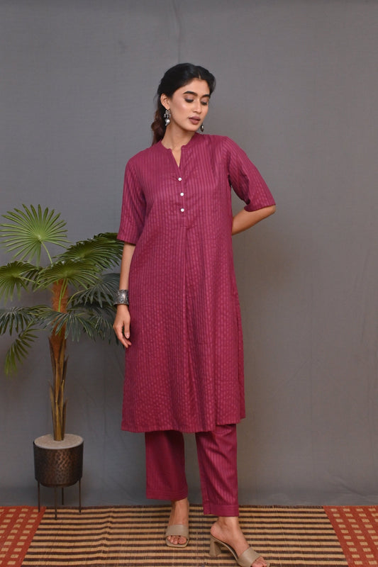 Discover elegance with our Grey Striped Handwoven High-Low Dress, featuring exquisite Kantha hand embroidery detailing....