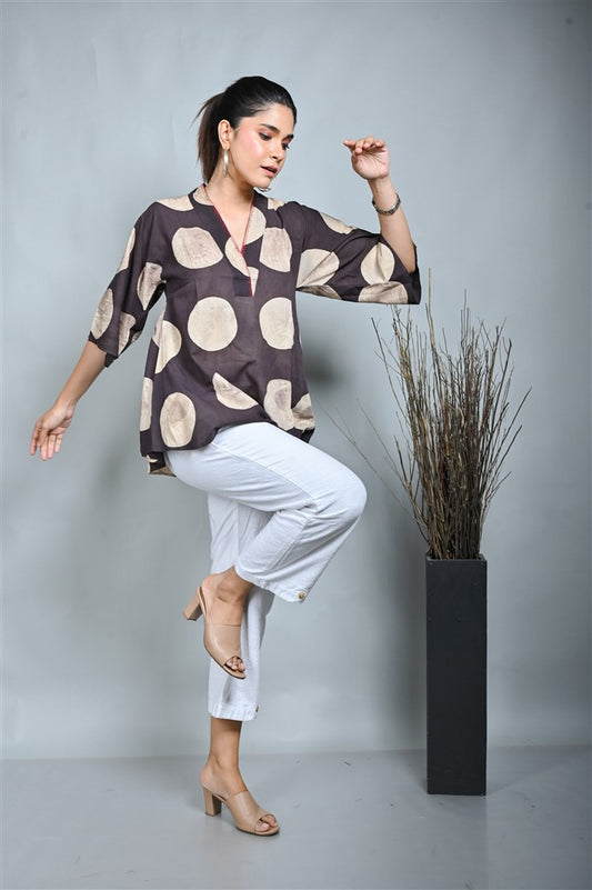 Brown Block Print Anti-fit Tunic with Hand Embroidery Detailing