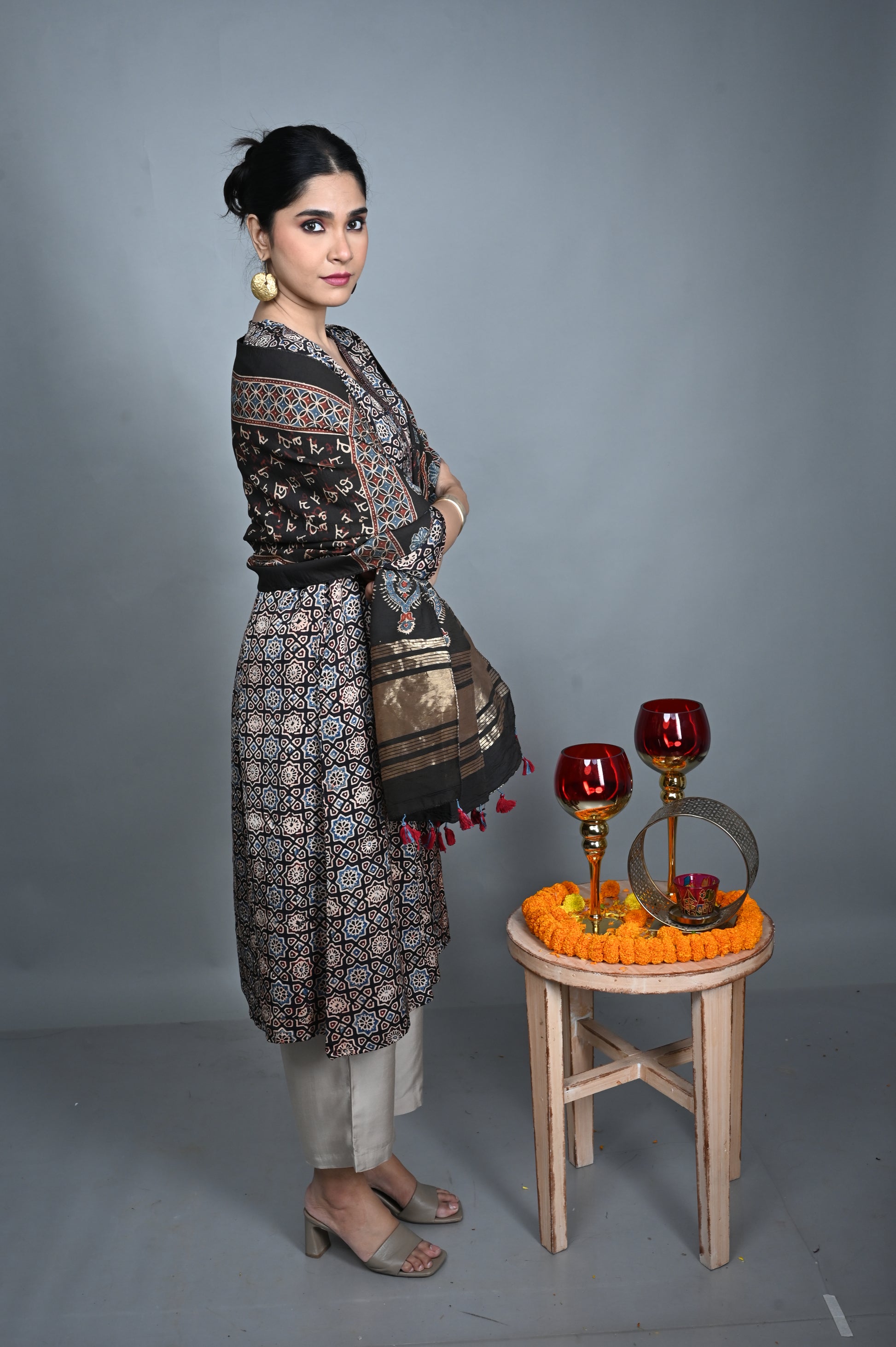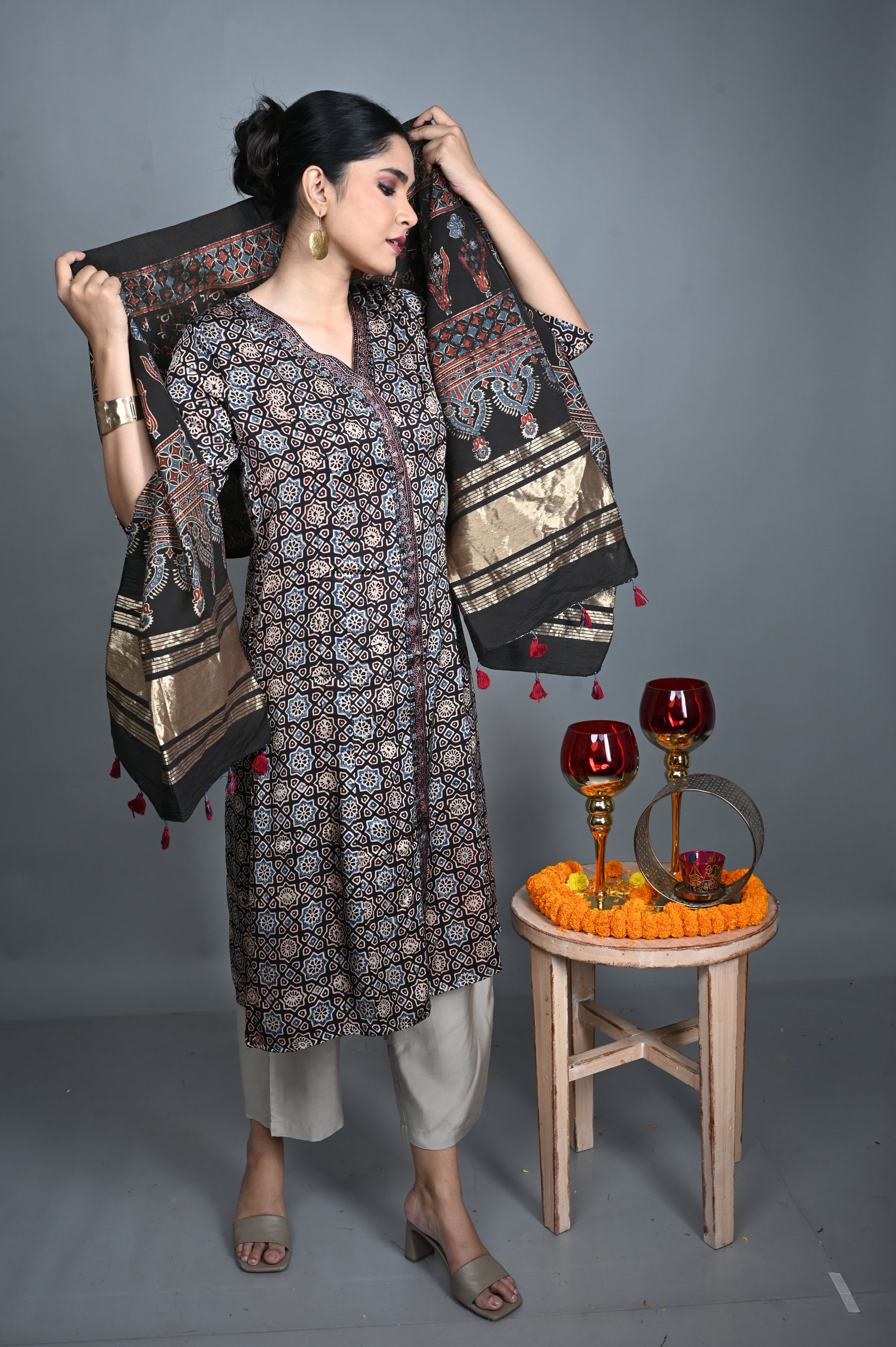 Crafted from breathable ajrakh cotton, this stole features intricate traditional prints and is enhanced with subtle chanderi silk detailing along the borders. Lightweight and elegant, it pairs beautifully with a variety of kurtas, adding a touch of artisanal sophistication to both festive and everyday ensembles