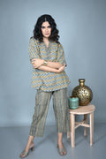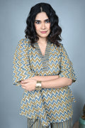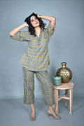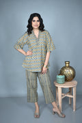 Crafted in breathable cotton, this Ajrakh zigzag hand block printed anti-fit top is designed for relaxed, everyday comfort. The easy silhouette allows free movement, while the traditional Ajrakh pattern adds depth and character. A versatile, craft-led piece that pairs effortlessly with pants, skirts, or co-ords for mindful, modern dressing.