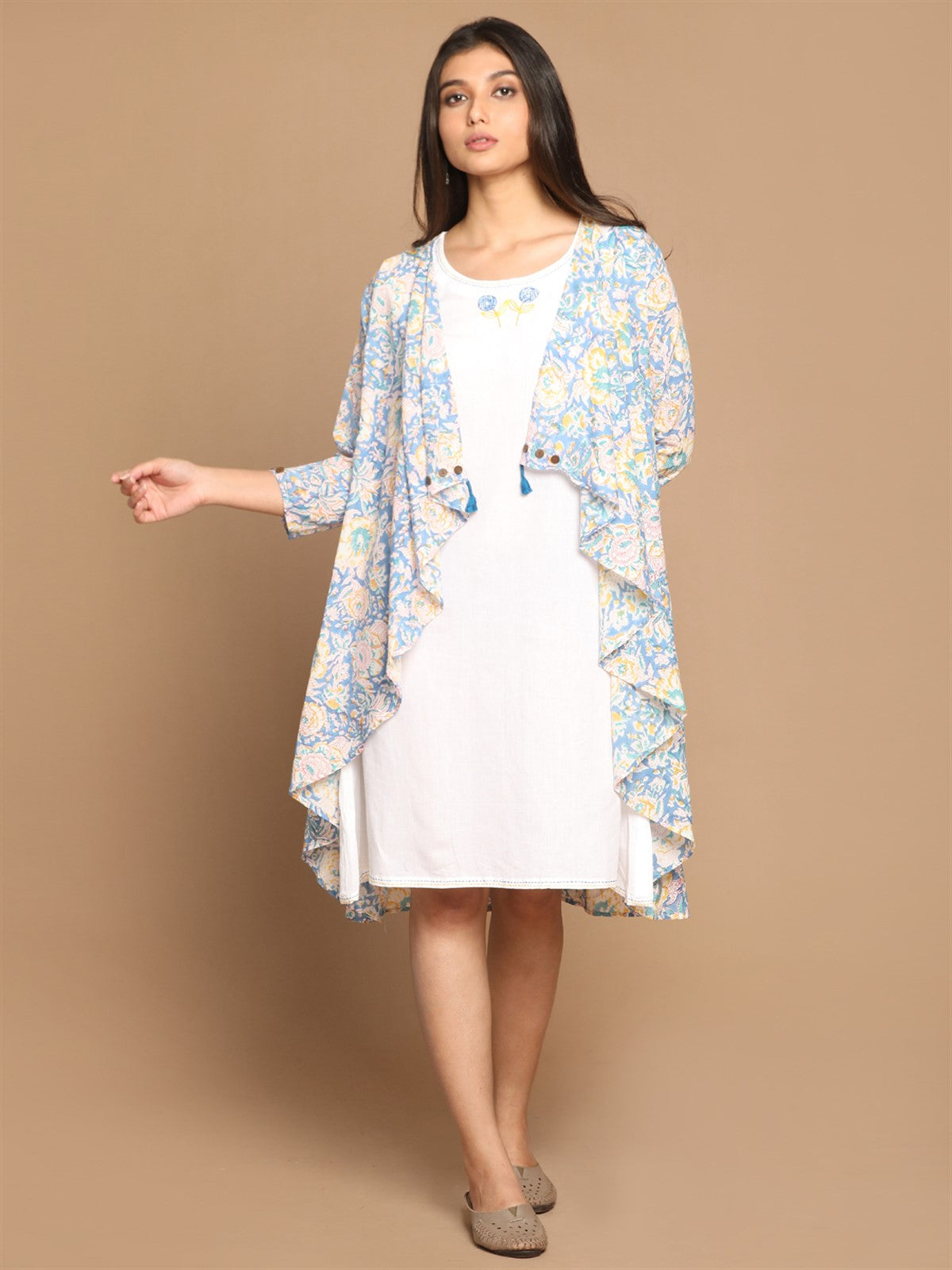 White-Blue Sleeveless Hand Embroidered Dress with Block Printed Asymmetrical Shrug Set of 2 (set of 2)