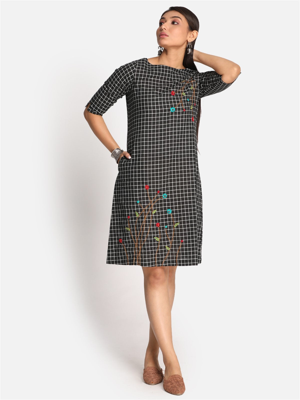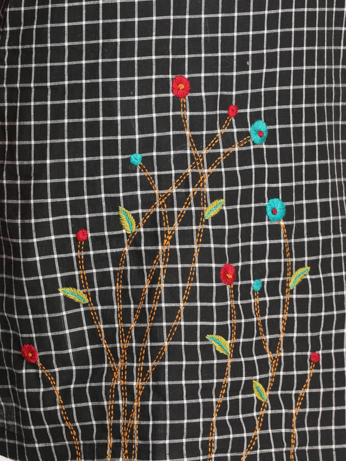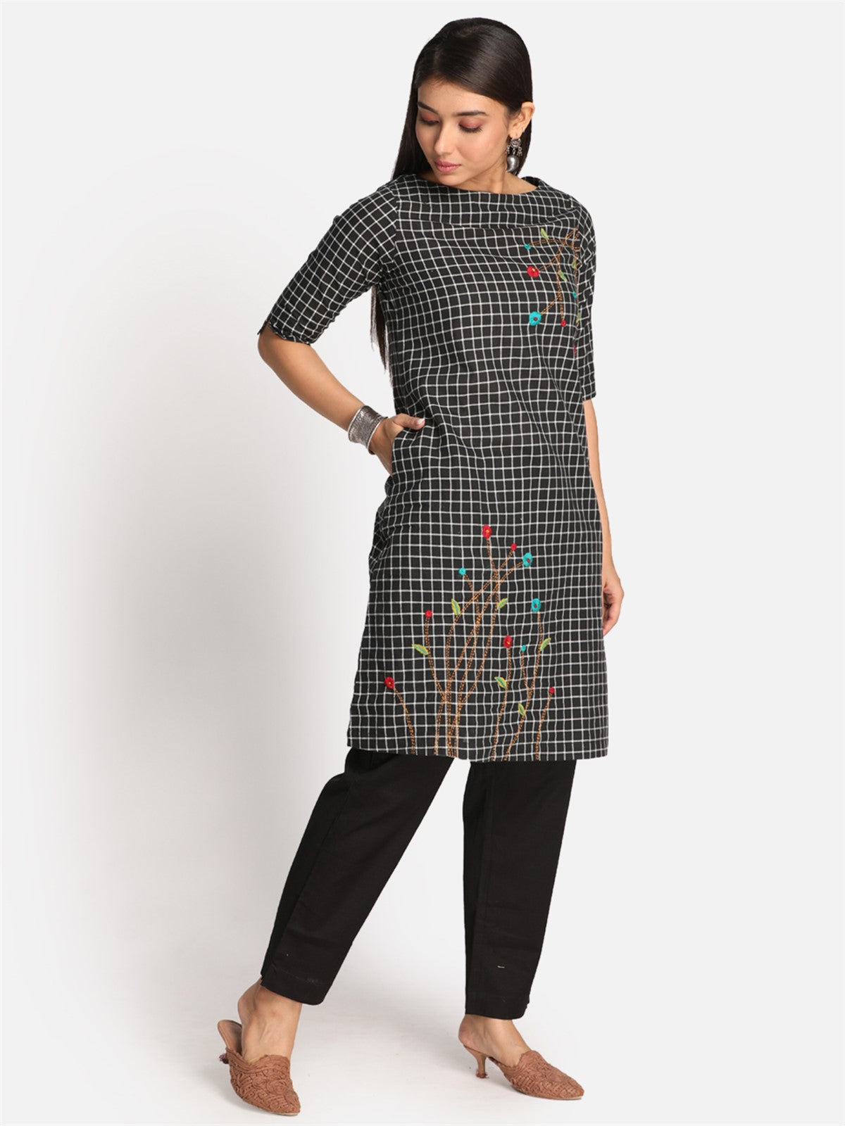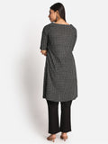 Black Checks Floral Kurta with Boat Neck & Hand Embroidery Detailing