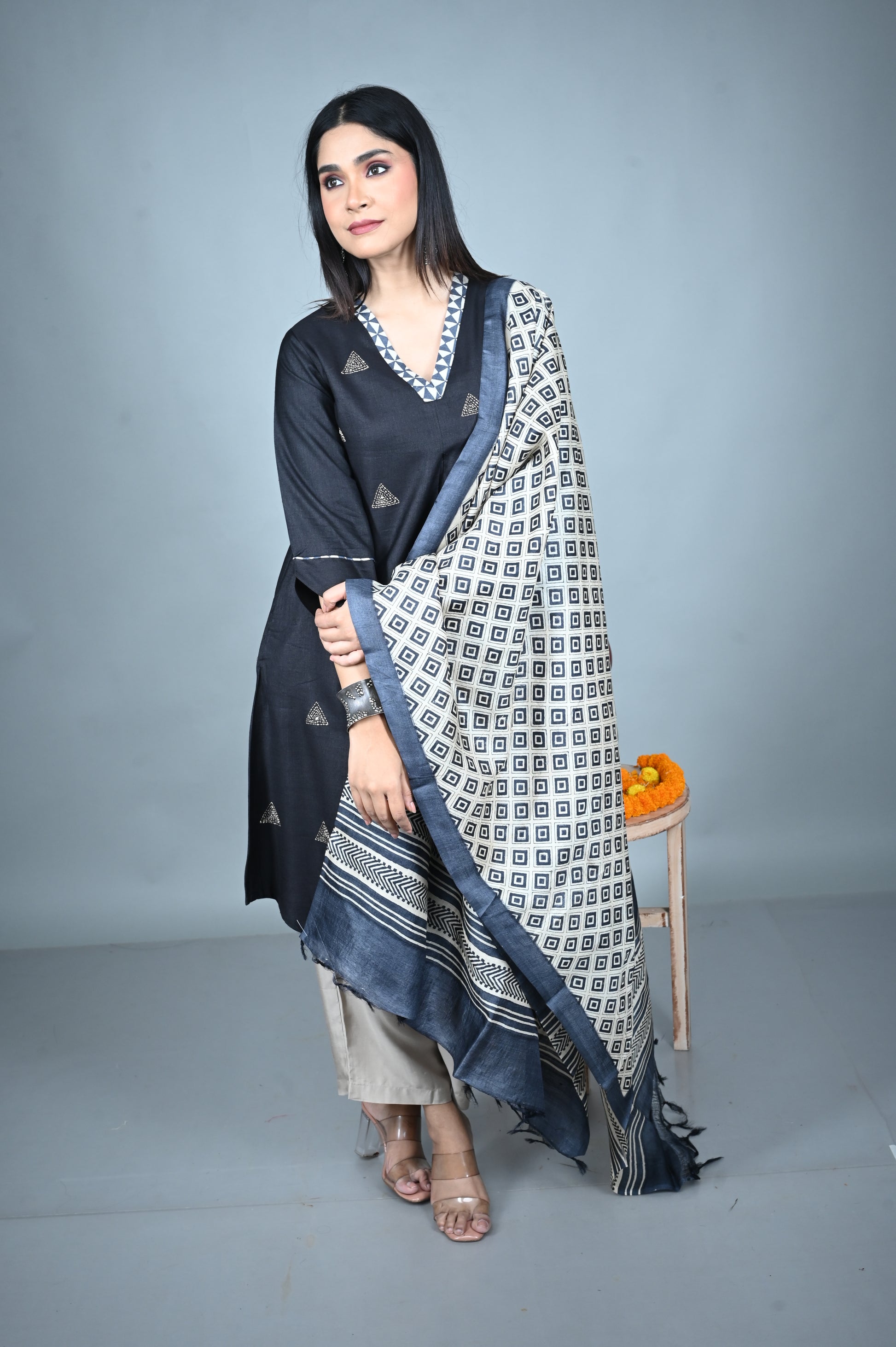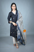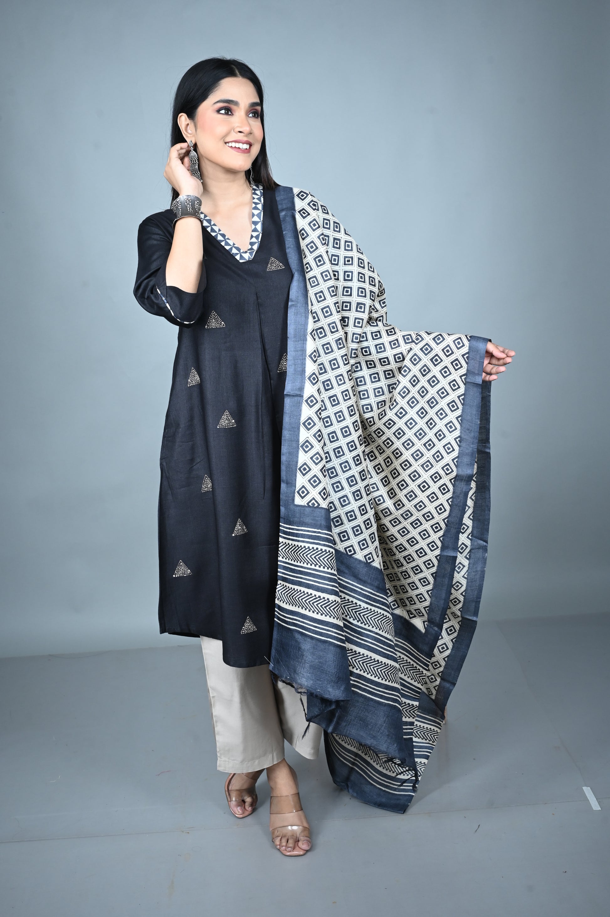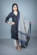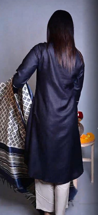 Elevate your festive wardrobe with this elegant Black Silk Slub Kurta, adorned with geometric Kantha hand-embroidered butis scattered gracefully all over. The rich texture of silk slub adds a subtle sheen, while the V-neckline with intricate patchwork detailing lends a touch of artisanal charm.