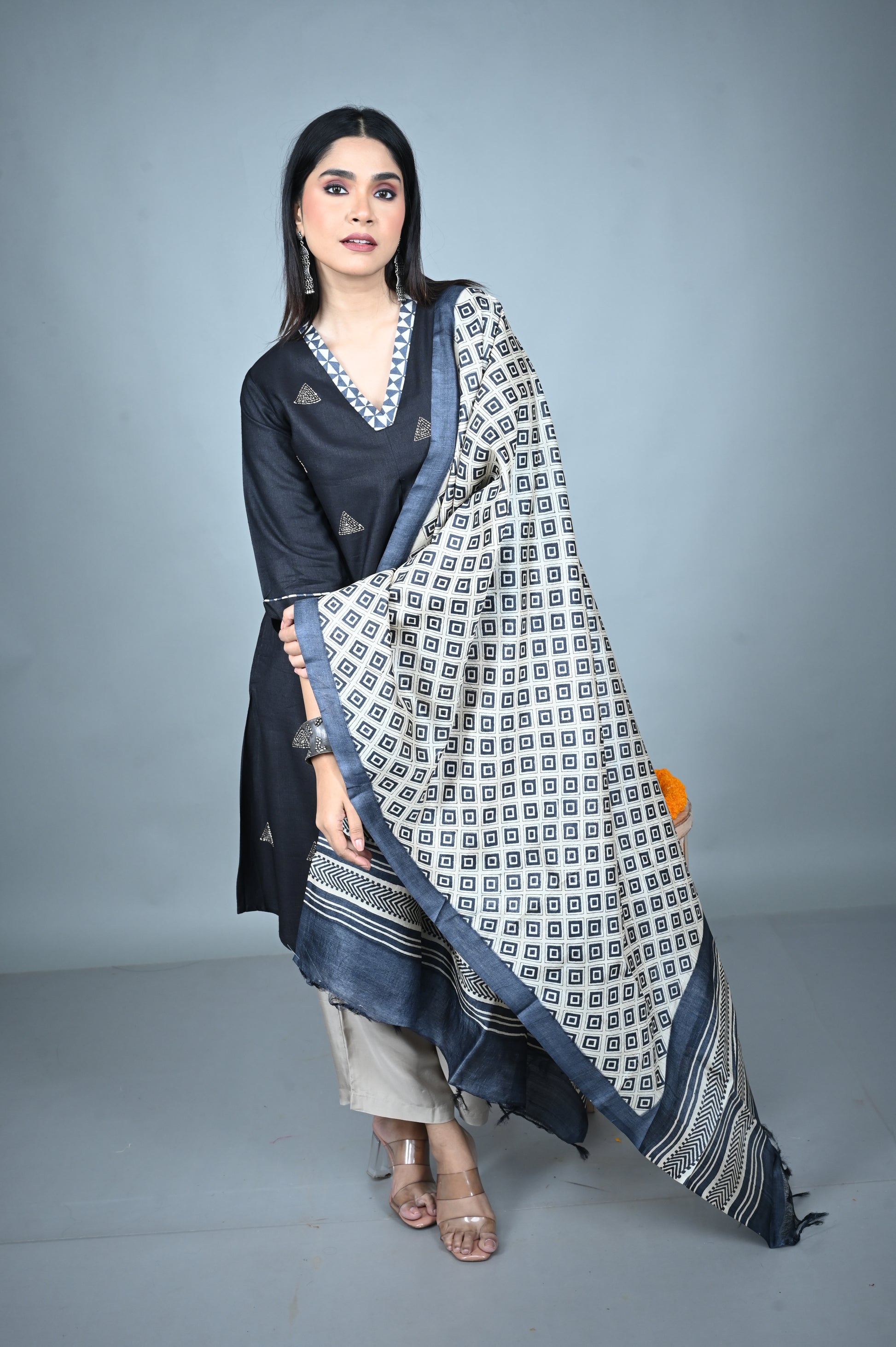 Black tassar Dupatta with White Hand Block Printing