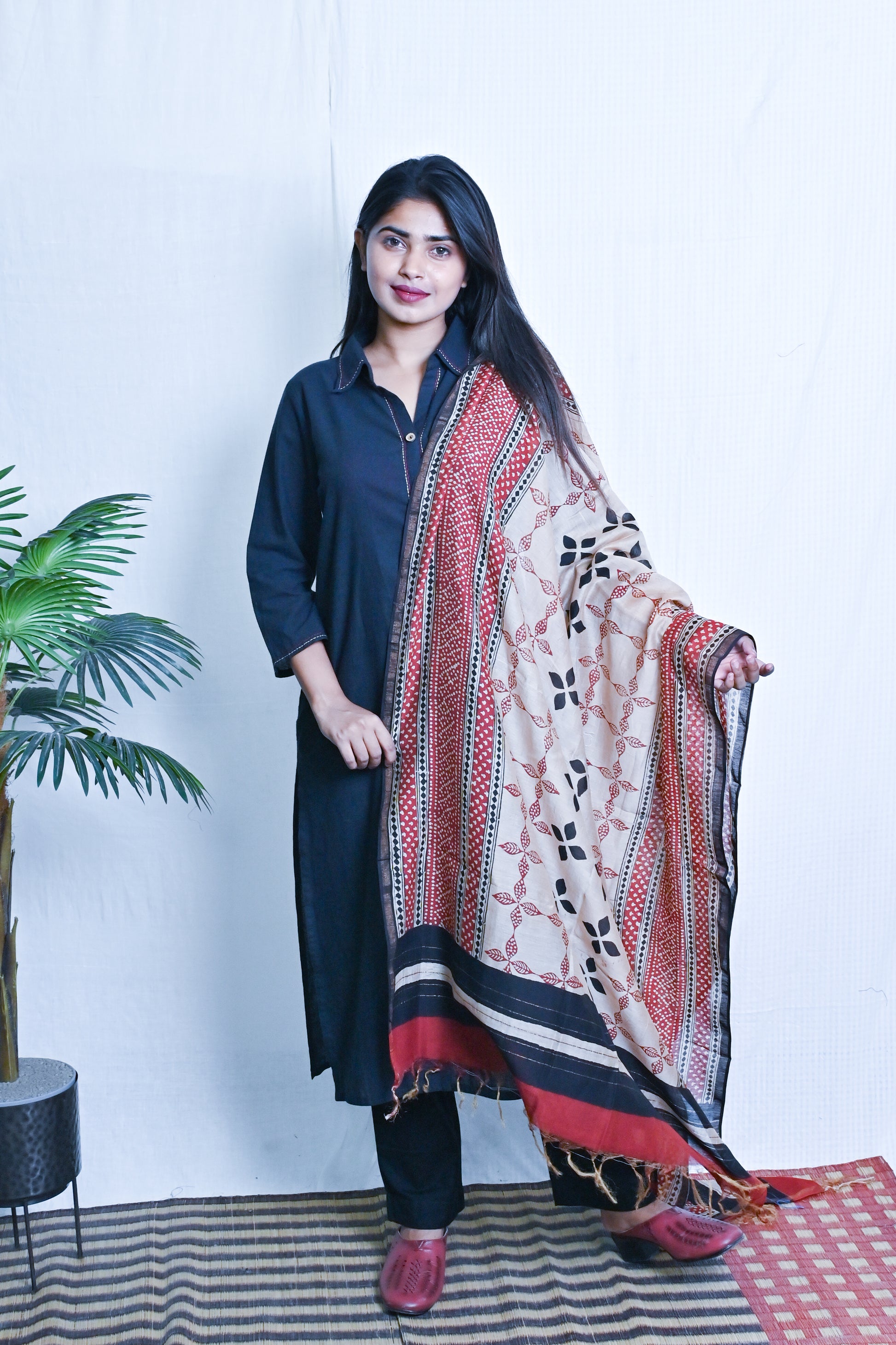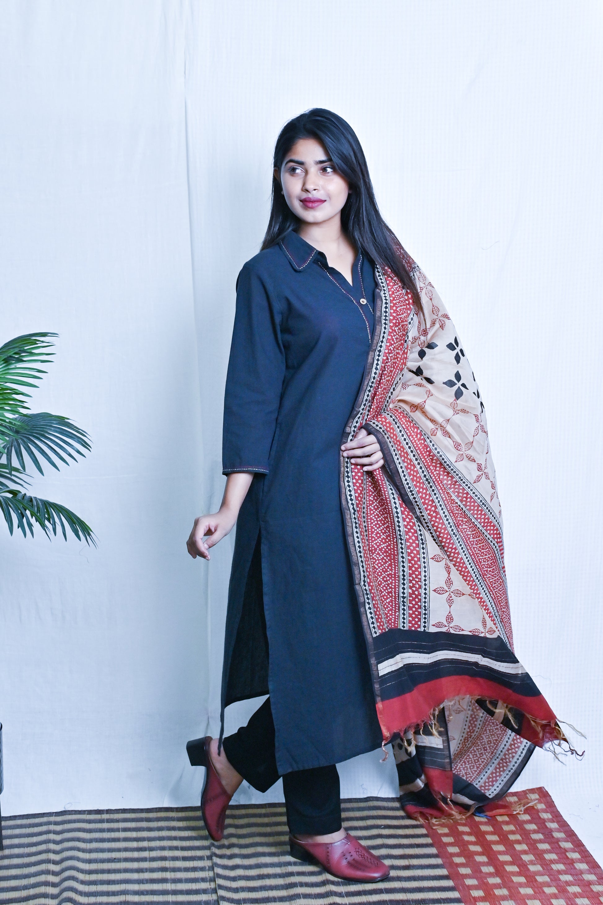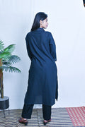 "Elevate your ethnic wardrobe with this Black Kantha Hand Embroidered Kurta, featuring intricate Kantha embroidery on the placket and collar. The straight-cut design with a stylish shirt collar adds a modern touch to timeless craftsmanship."