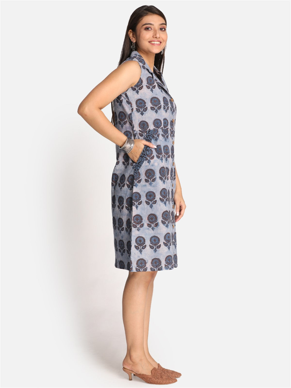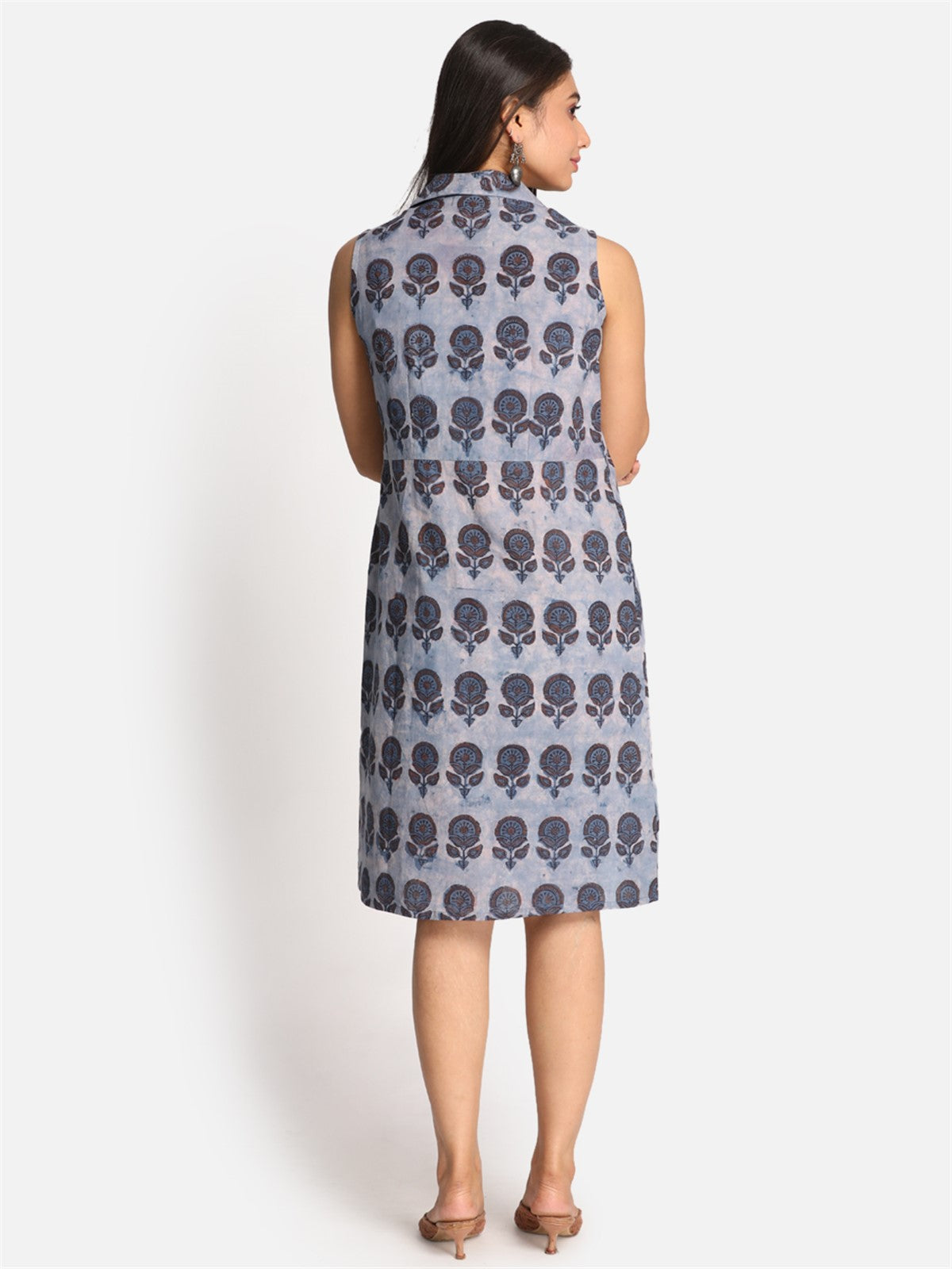 Discover the elegance of our Blue Ajrakh Print Cotton Shirt Collar Sleeveless Dress. Perfect for any occasion, this dress combines comfort with style.