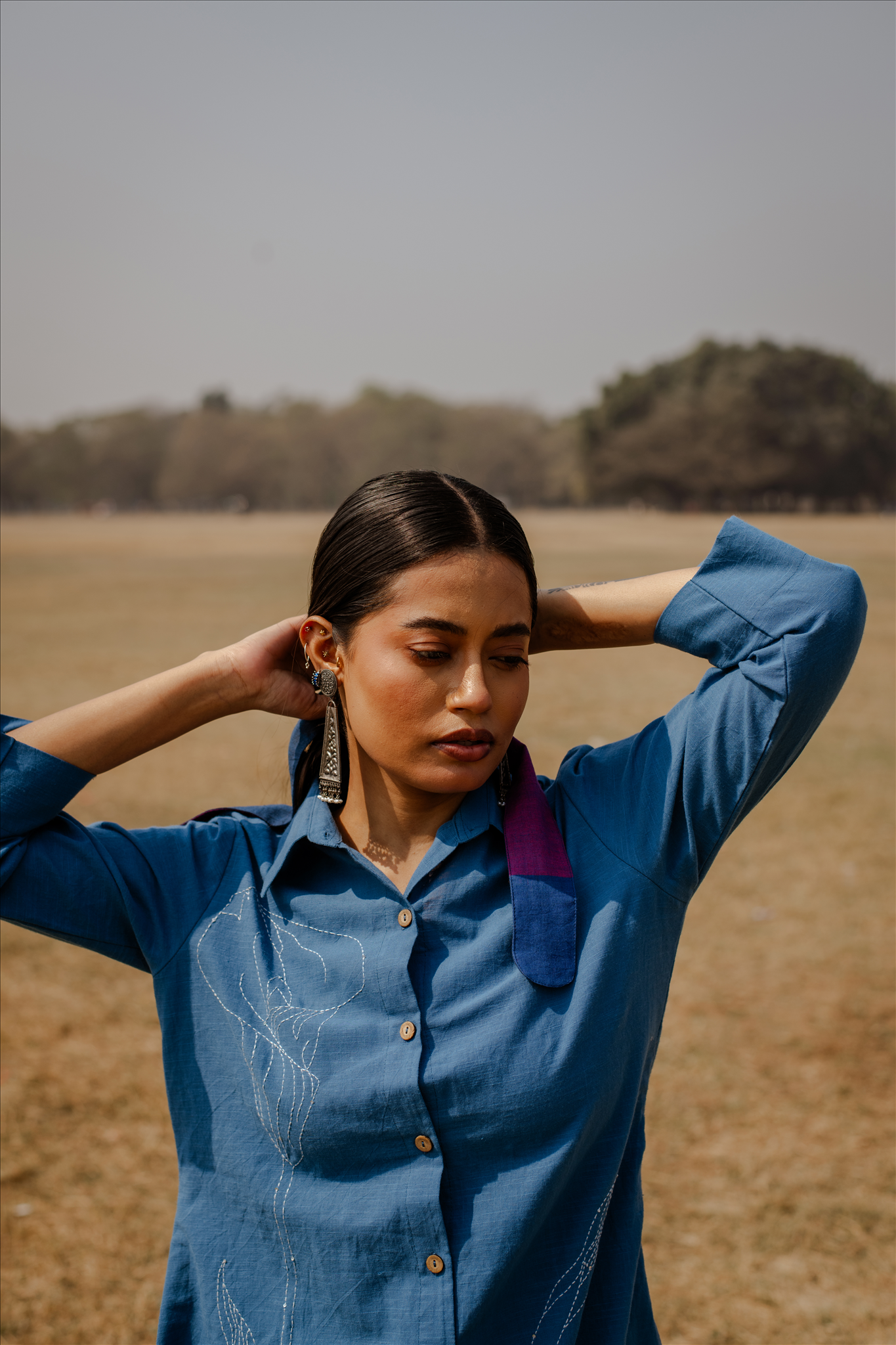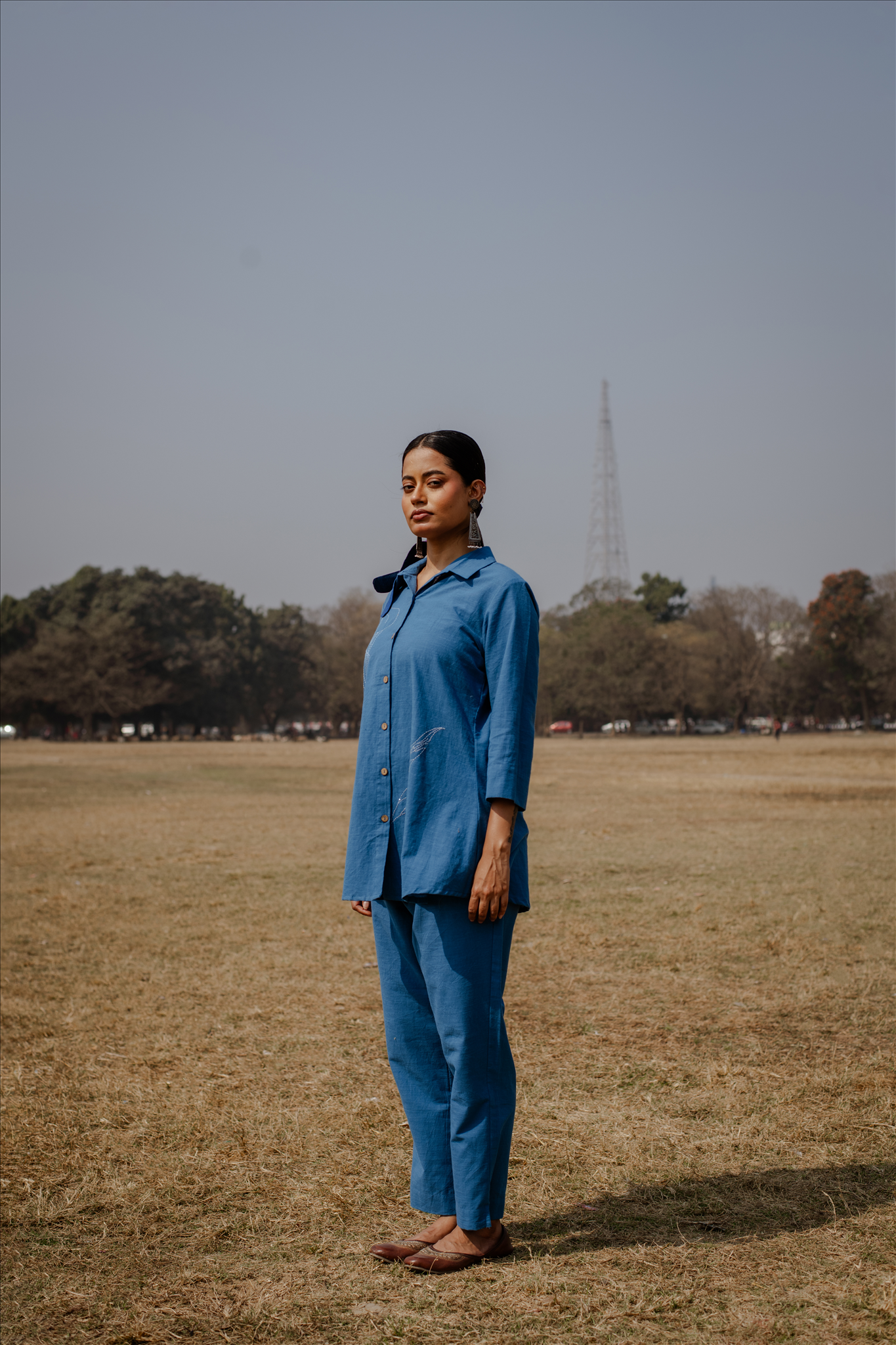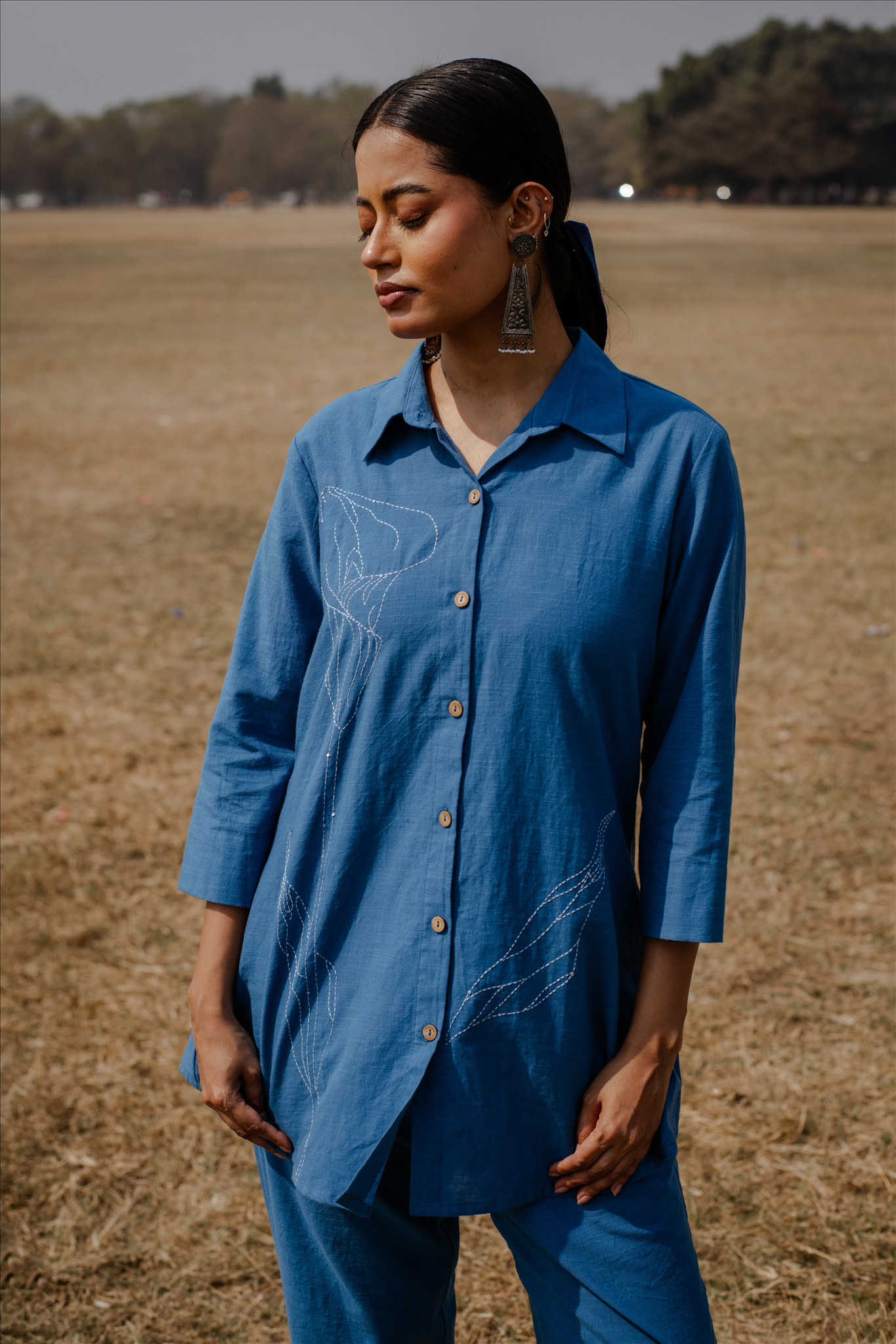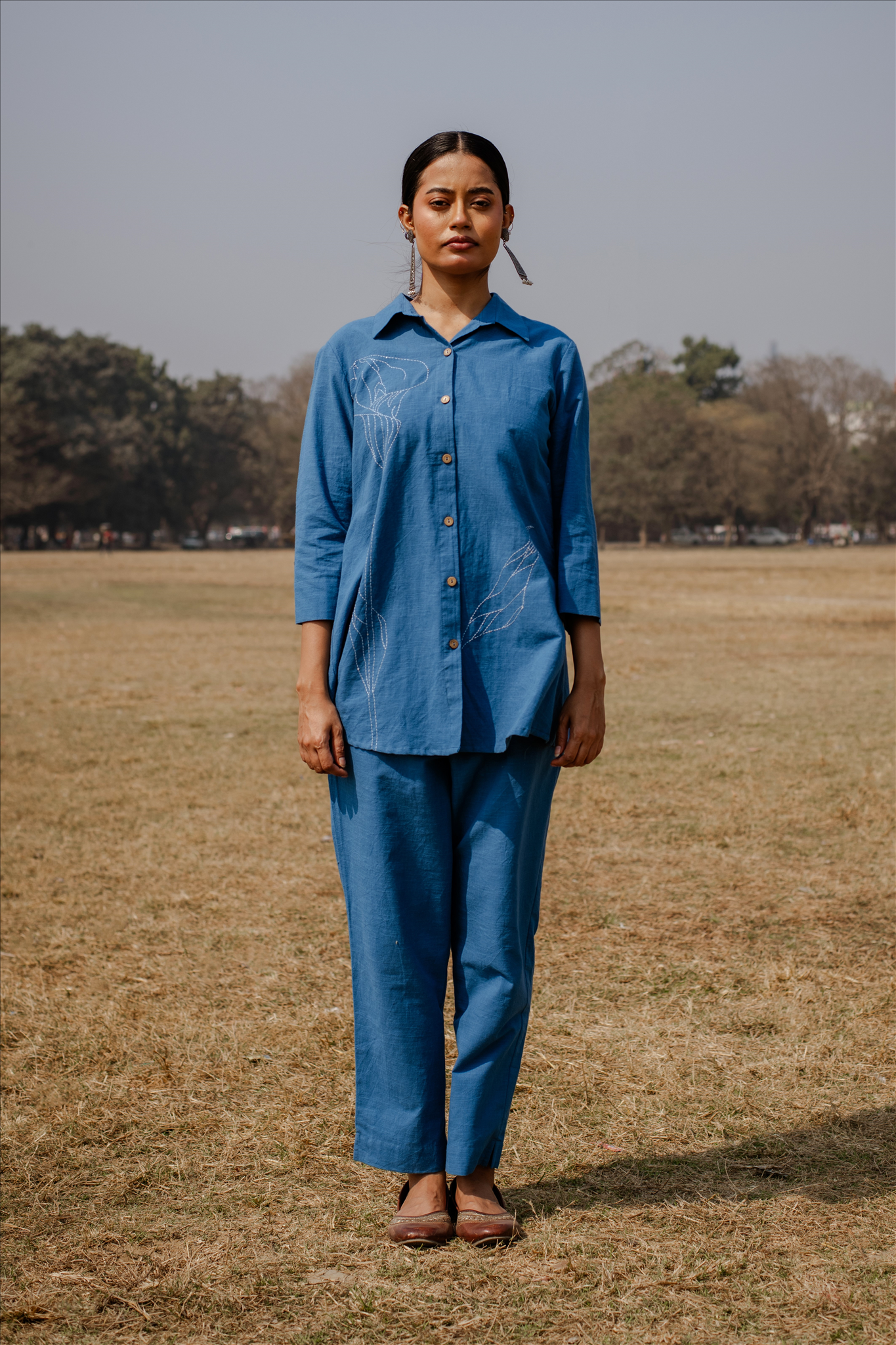 A relaxed cotton co-ord set designed for everyday ease. The shirt-style top features a classic collar with hand embroidery that adds subtle character to the garment. Paired with straight cotton pants, the set feels breathable and comfortable through long days. Wear it together for a clean coordinated look or style the shirt separately with denims or neutral trousers for versatile everyday wear.