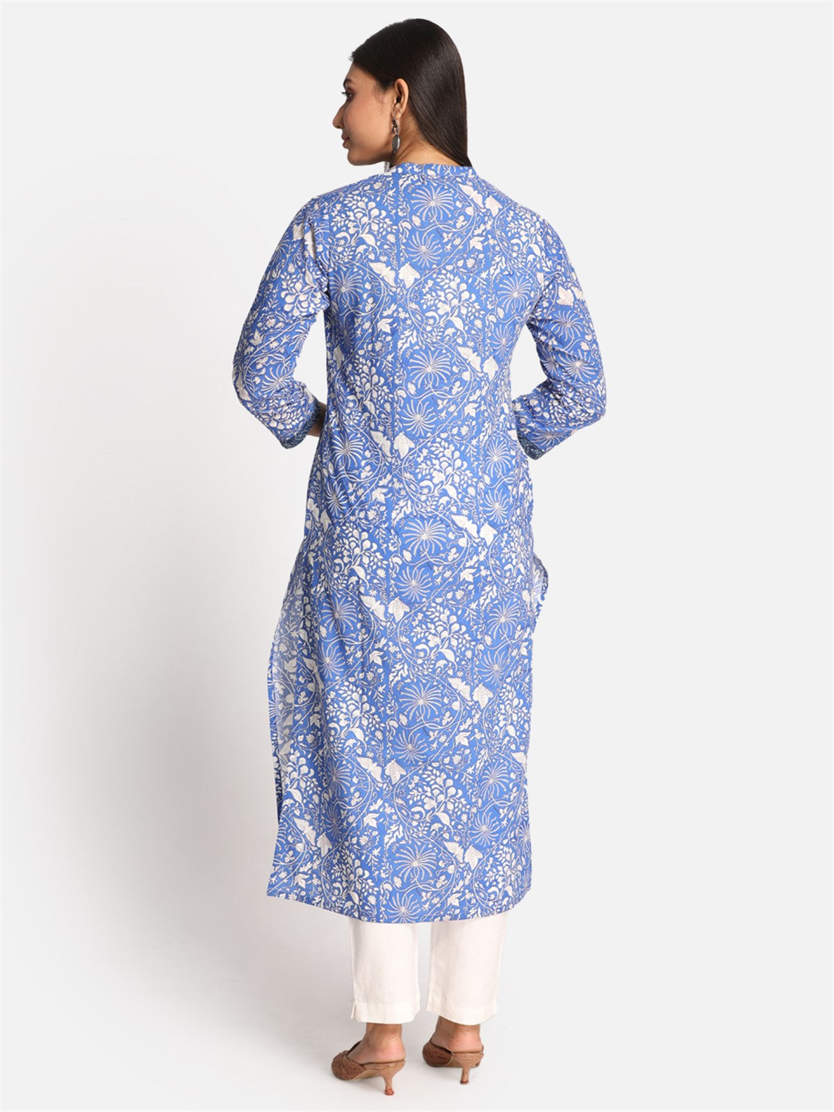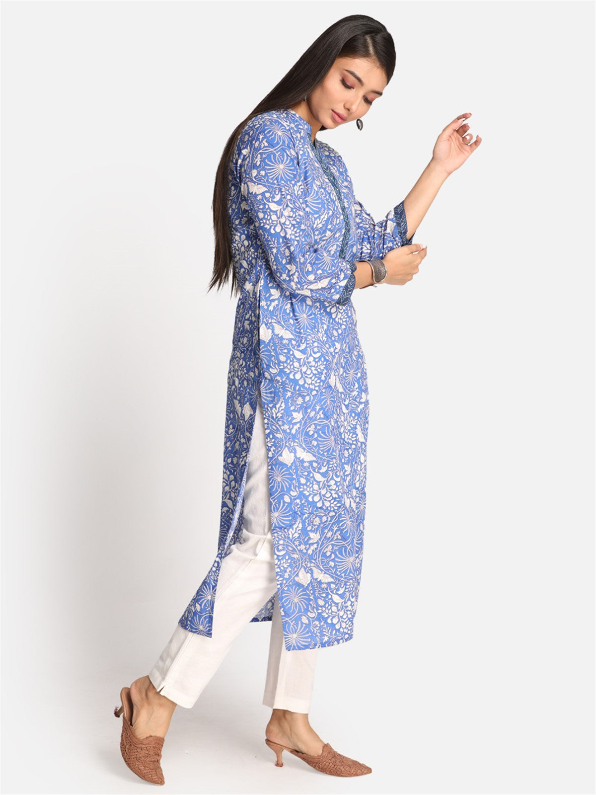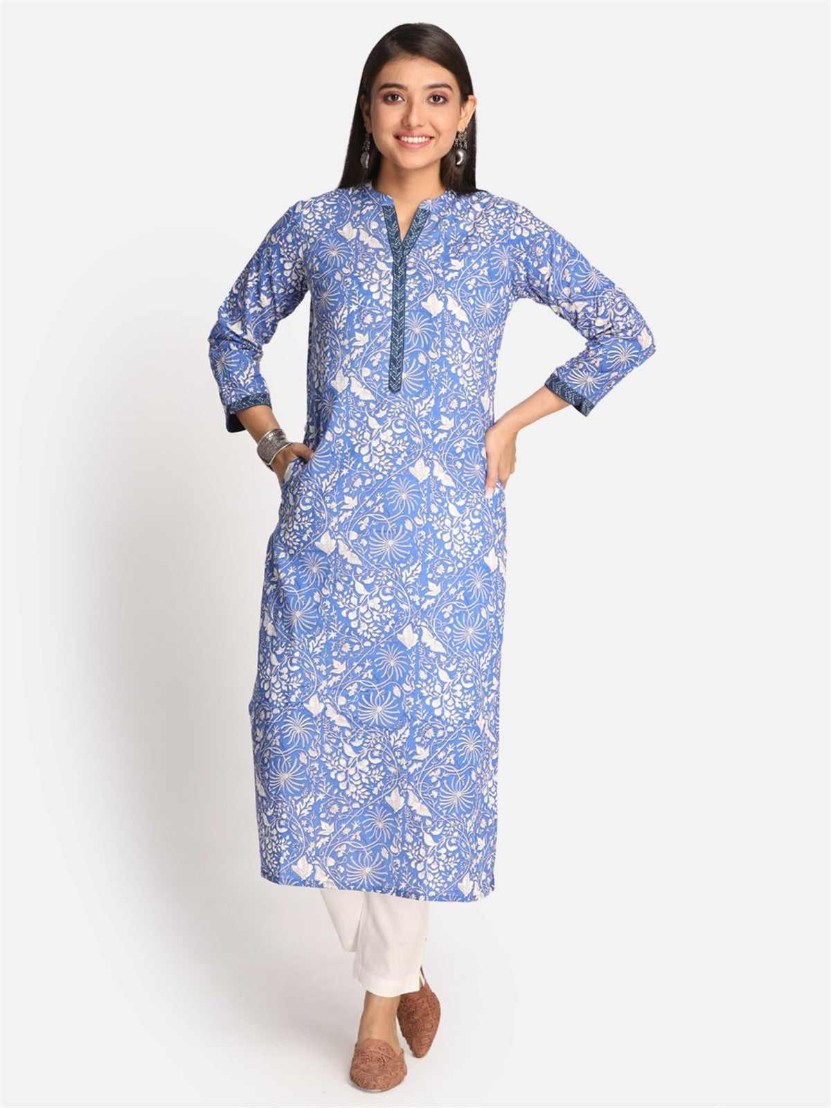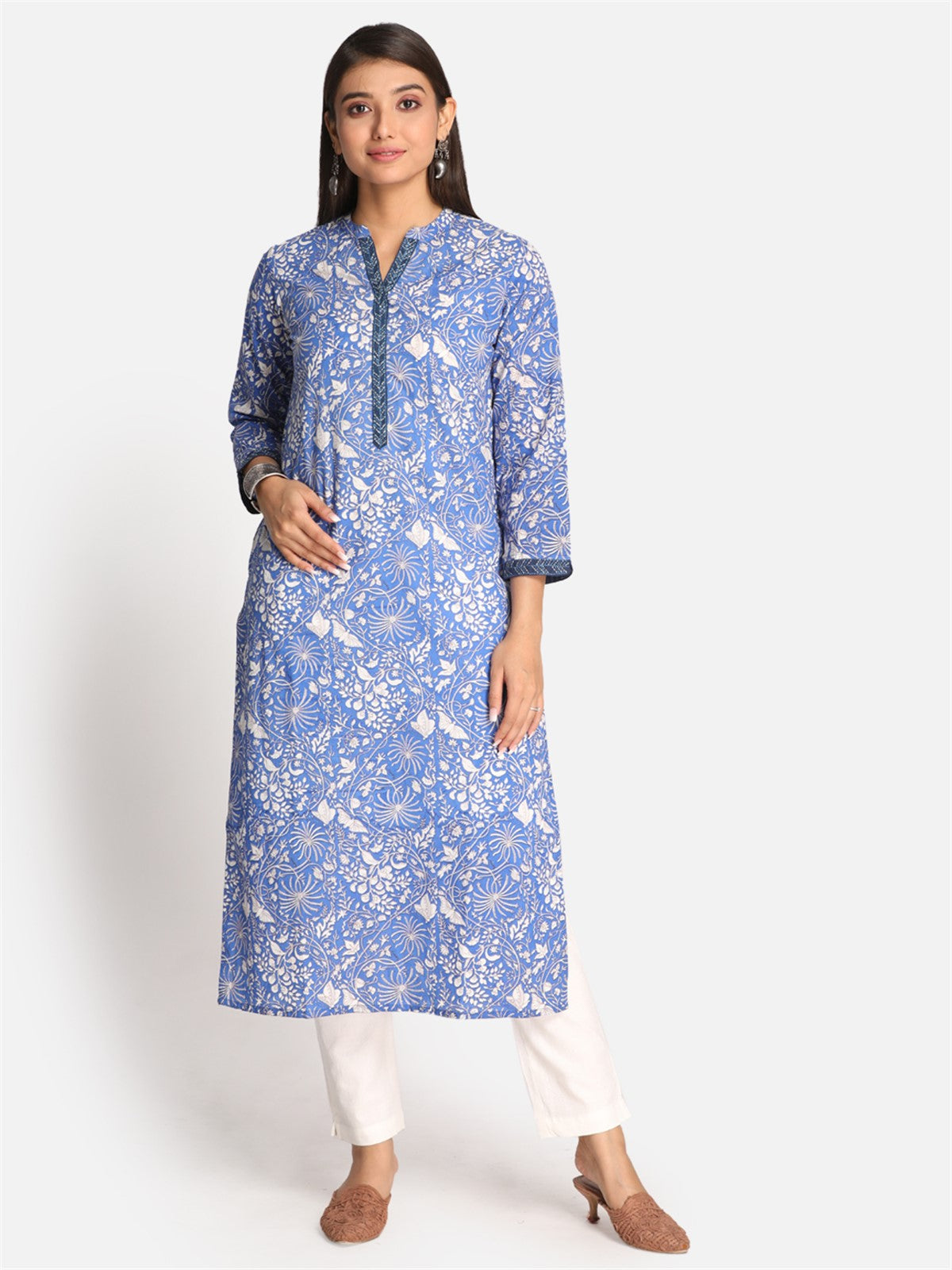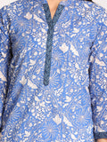 Blue Printed Cotton Kurta with Hand Embroidery Detailing