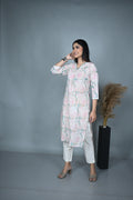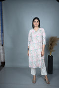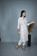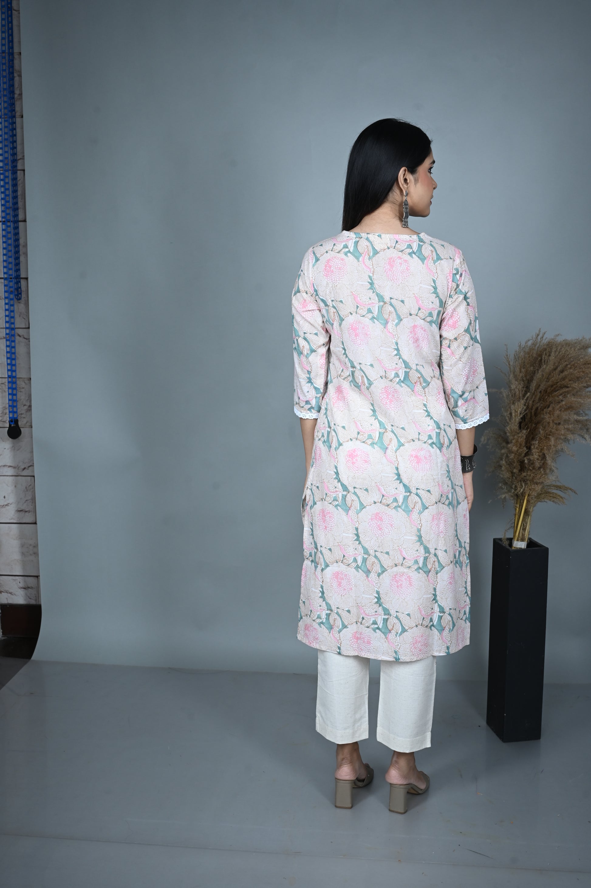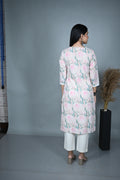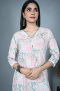 Crafted in soft cotton, this pastel-toned kurta features an elegant floral dabu block print in shades of blush pink and sage green. The V-neckline is delicately enhanced with fine hand embroidery, adding a subtle artisanal touch. Designed with three-quarter sleeves finished with lace trims, this kurta blends traditional charm with contemporary ease — perfect for both everyday wear and special gatherings.