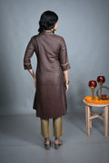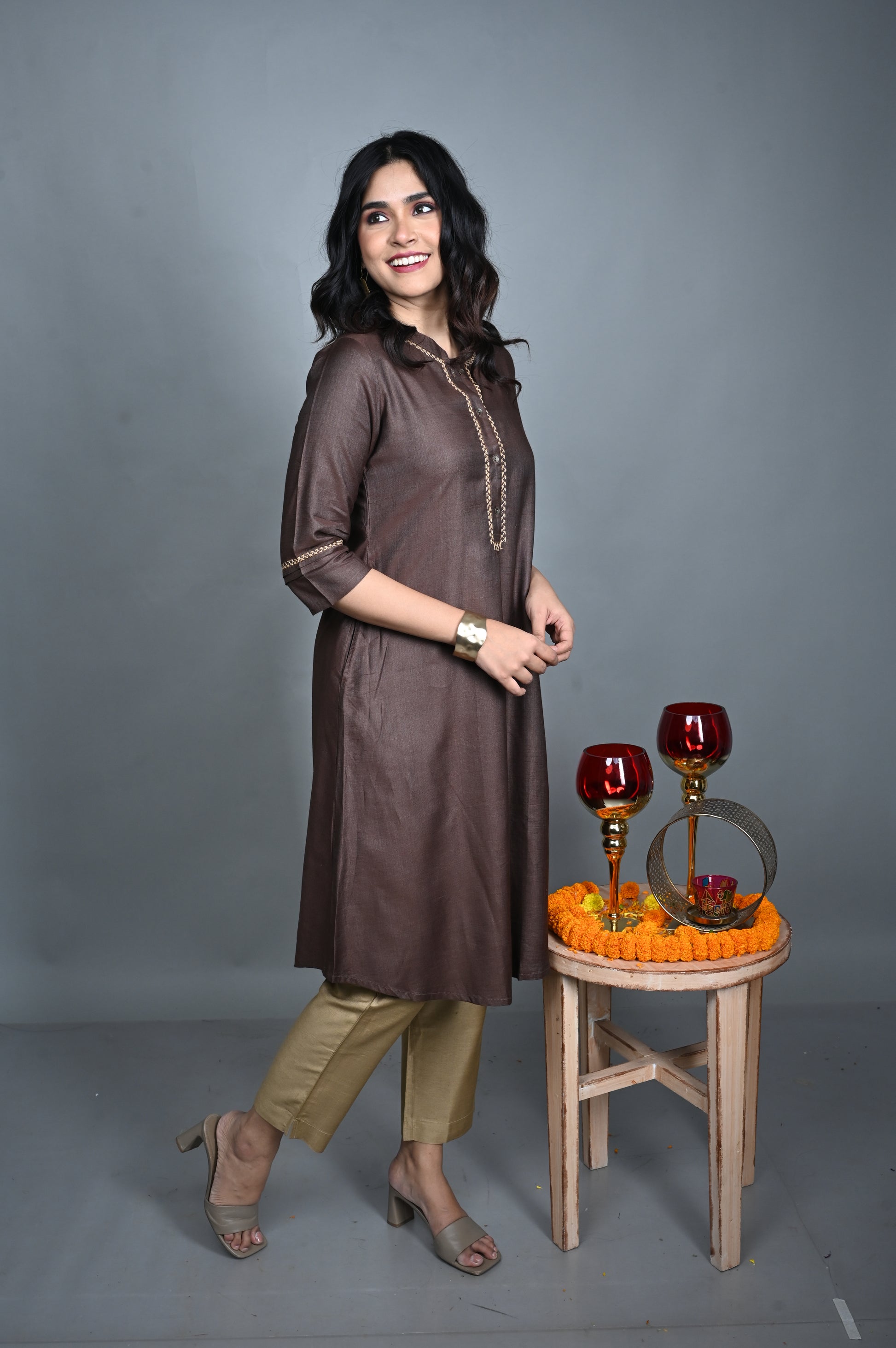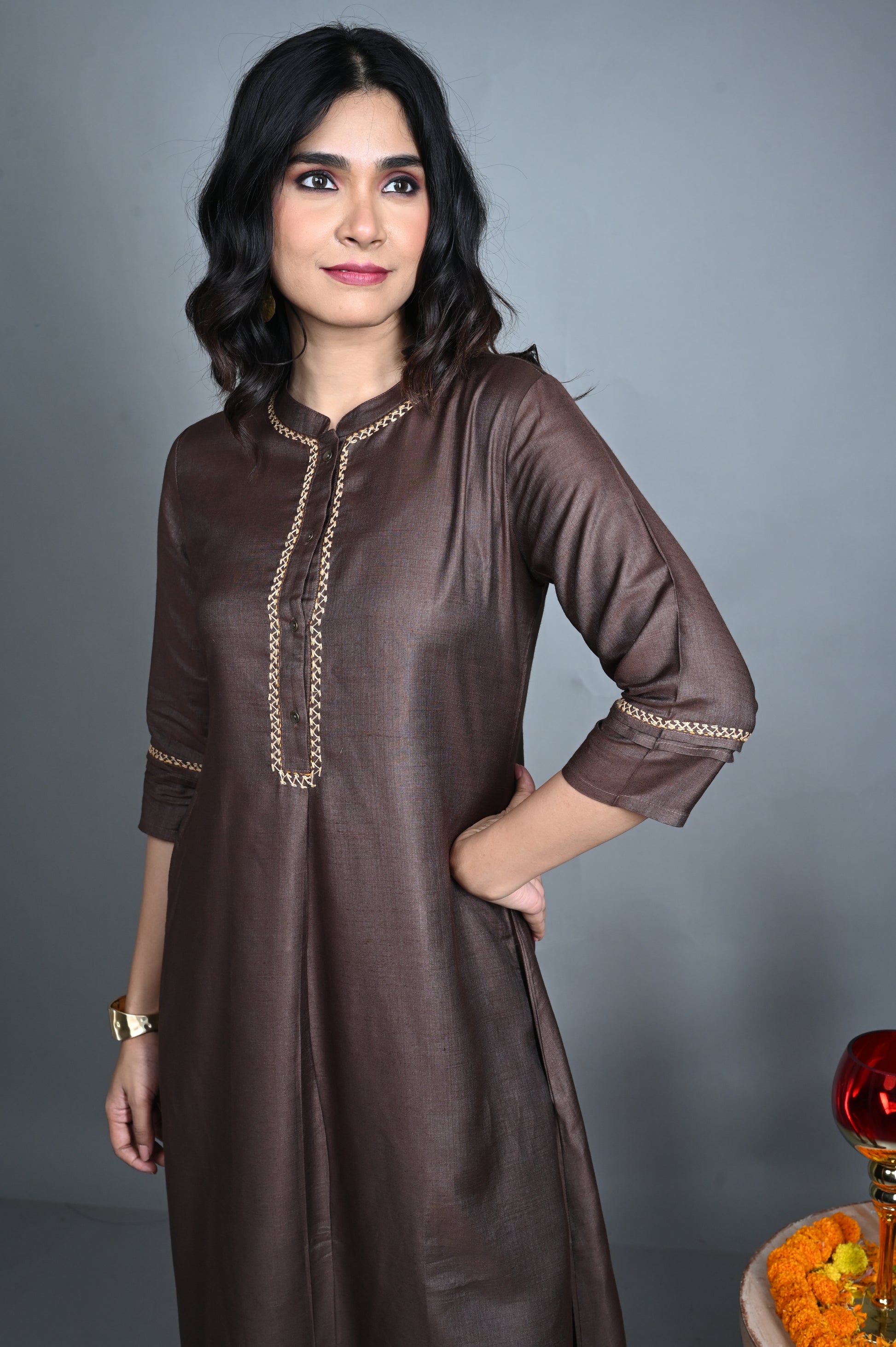 Crafted from soft silk slub, this chocolate-hued kurta features a flattering A-line silhouette and a graceful neckline adorned with delicate kantha hand embroidery. Finished with three-quarter sleeves, this elegant piece seamlessly blends timeless tradition with contemporary wearability β perfect for festive occasions and everyday sophistication