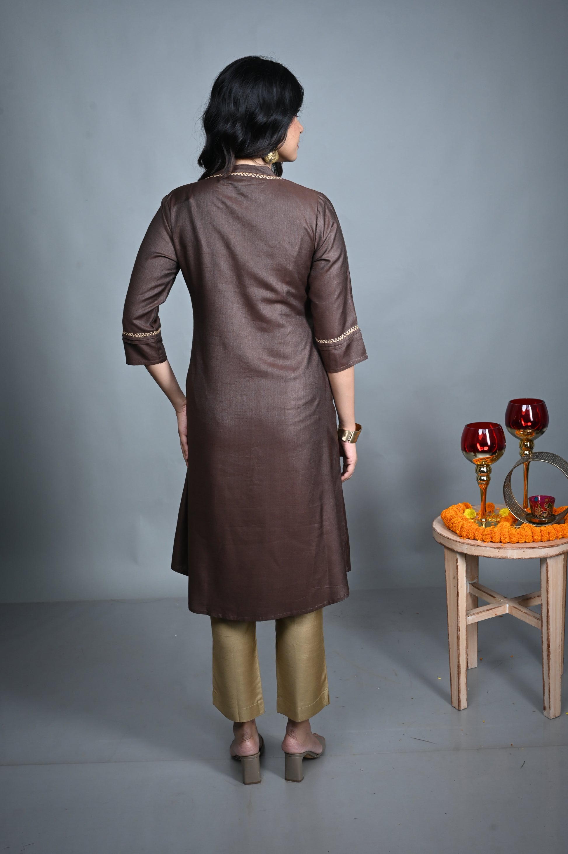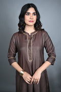 Chocolate Silk Slub A-Line Kurta with Hand Embroidery and Gold Silk Slub Pants Co-ord Set (set of 2)