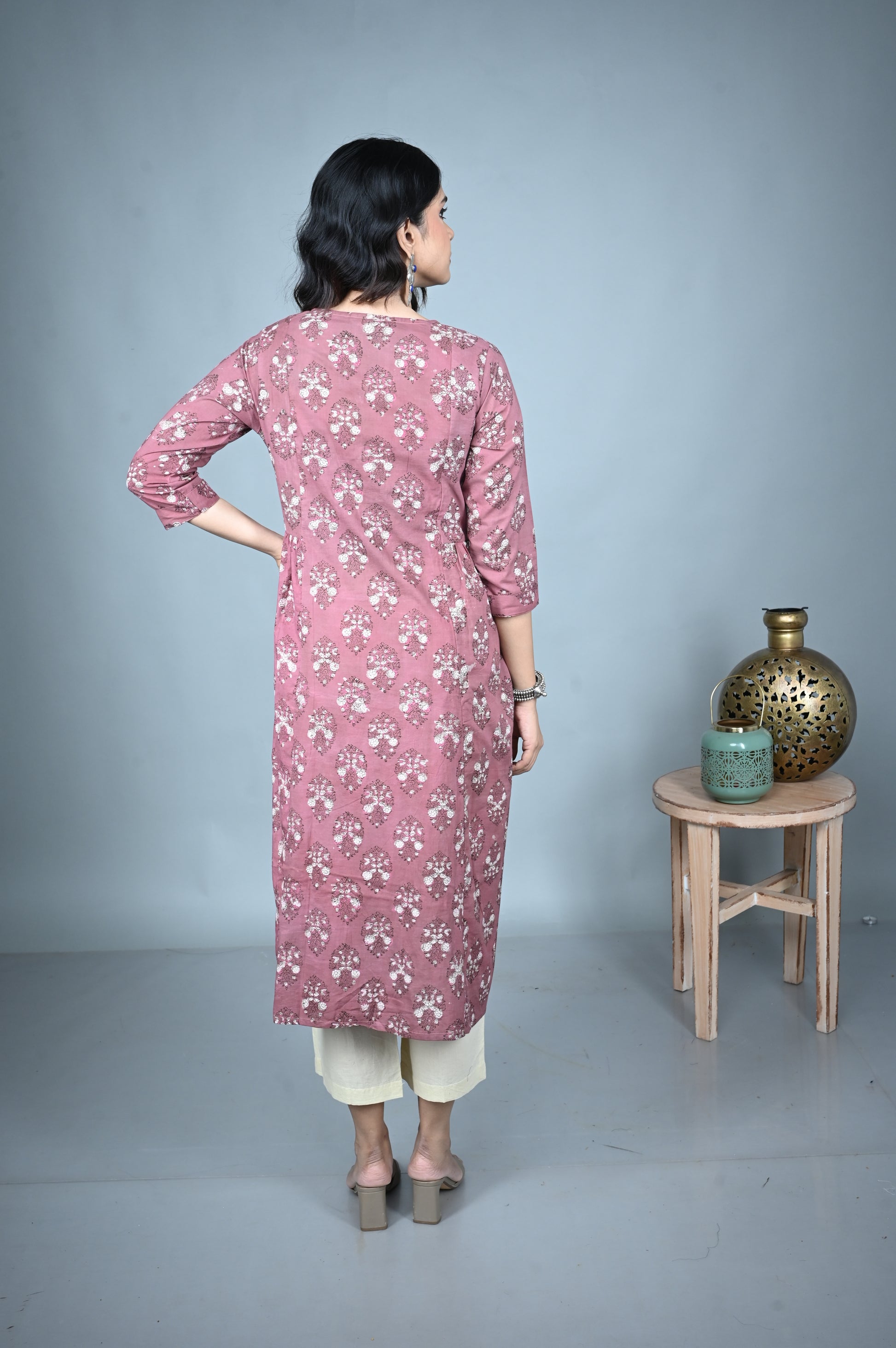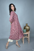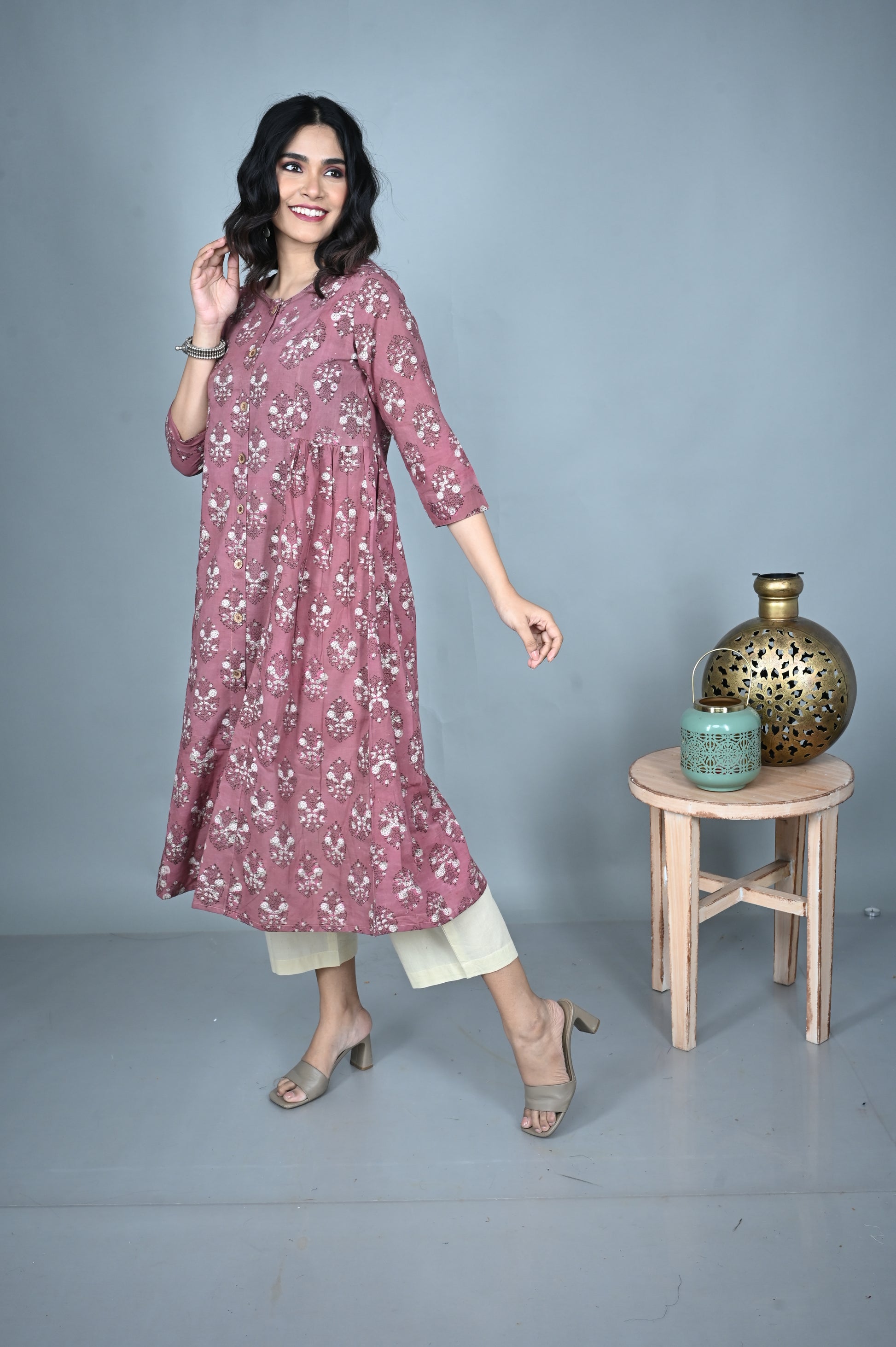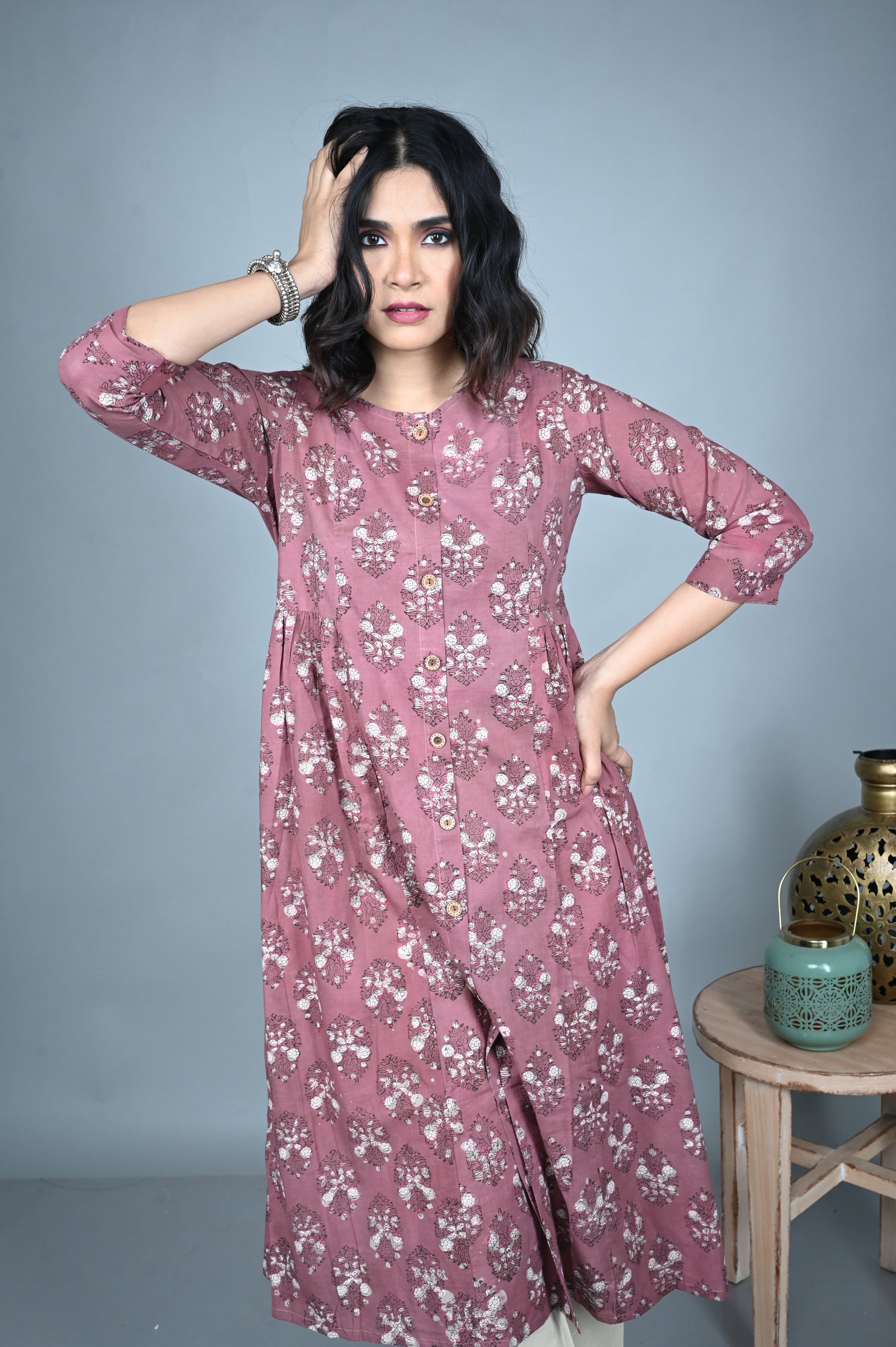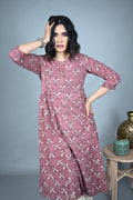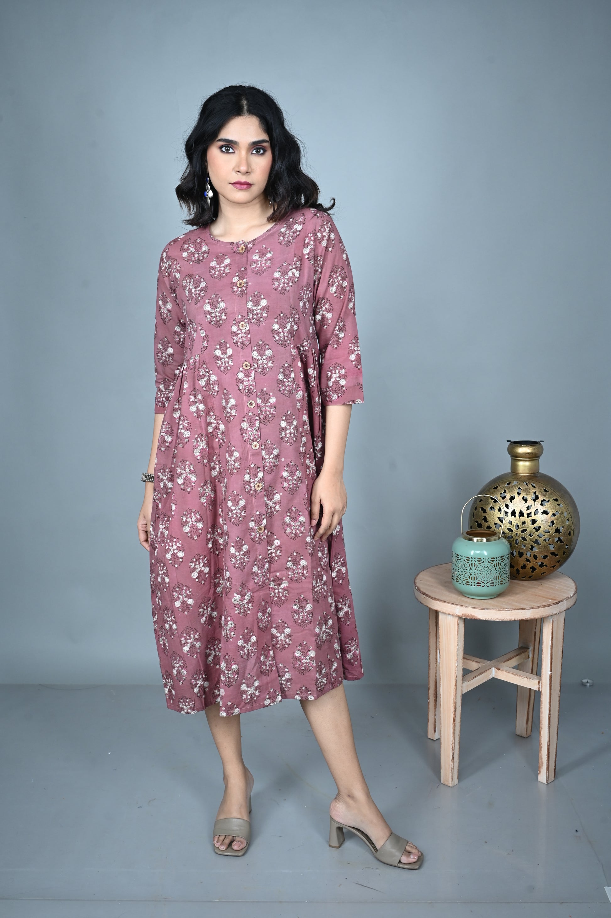 Crafted in a soothing earthy pink hue, this A-line dress is adorned with delicate floral Dabu hand block prints all over, celebrating timeless artisanal craft. The side-gathered detailing adds a graceful drape and subtle movement, giving the silhouette a flattering flow. Comfortable yet refined, this dress is perfect for both everyday elegance and special occasions, effortlessly blending tradition with contemporary charm.