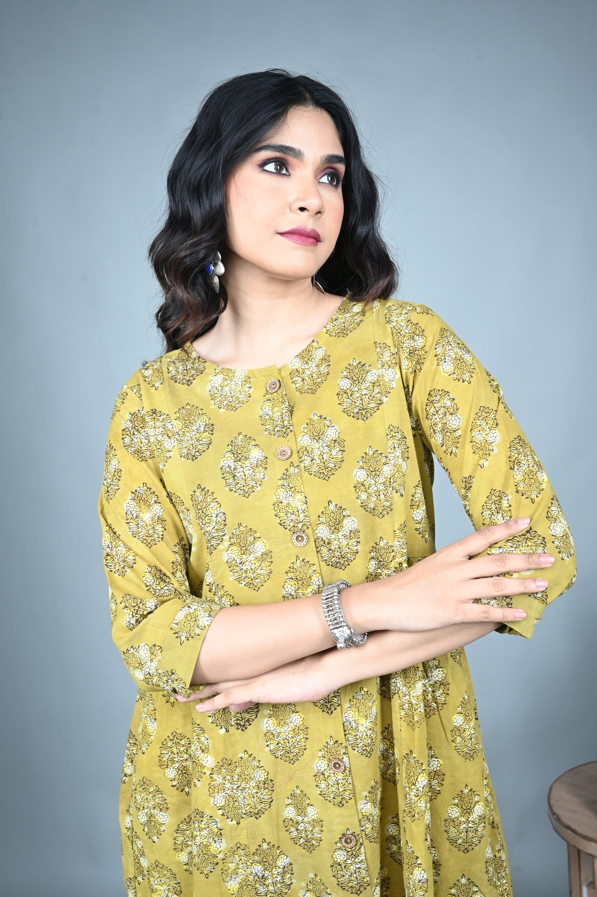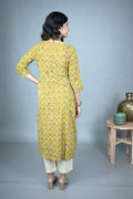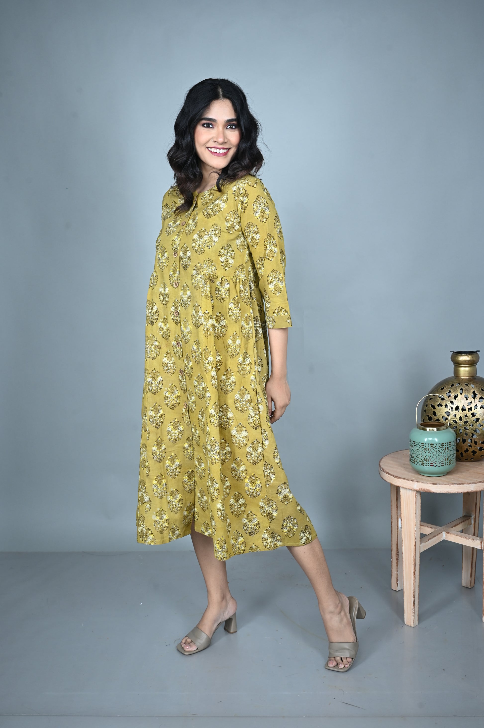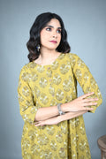 In a warm earthy yellow hue, this A-line dress is enlivened with all-over floral Dabu hand block prints that bring a touch of artisanal charm. The side-gathered detail enhances the flow of the silhouette, adding subtle grace and movement. Blending comfort with elegance, this versatile dress is ideal for everyday sophistication or festive occasions.