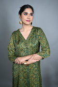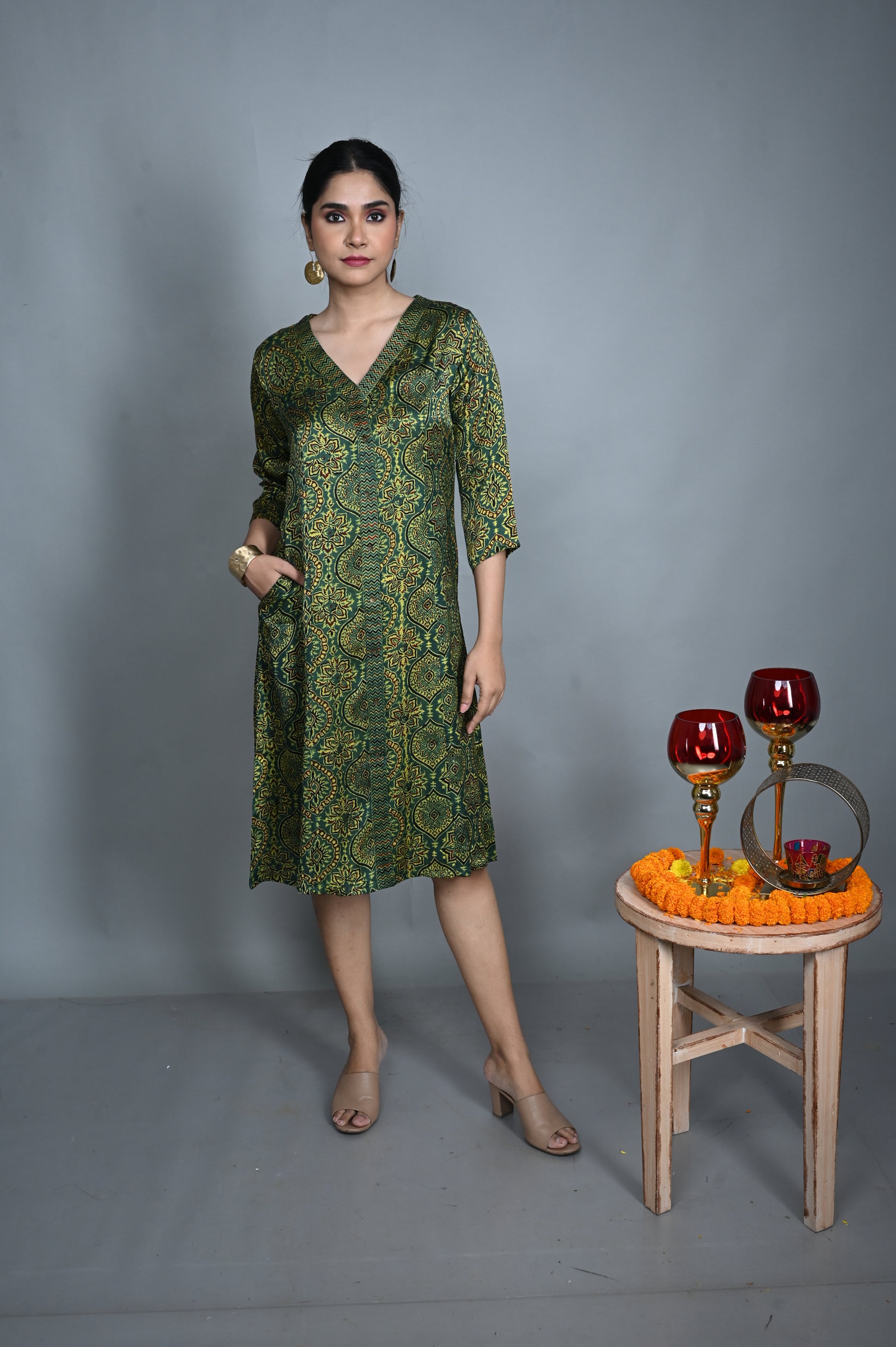 Exquisitely crafted from luxurious modal silk, this emerald green dress features a sophisticated V-neckline adorned with intricate floral motifs, reflecting artisanal finesse. Designed for a flowing, elegant silhouette, it effortlessly balances timeless charm with contemporary style β perfect for festive occasions or refined everyday wear.
