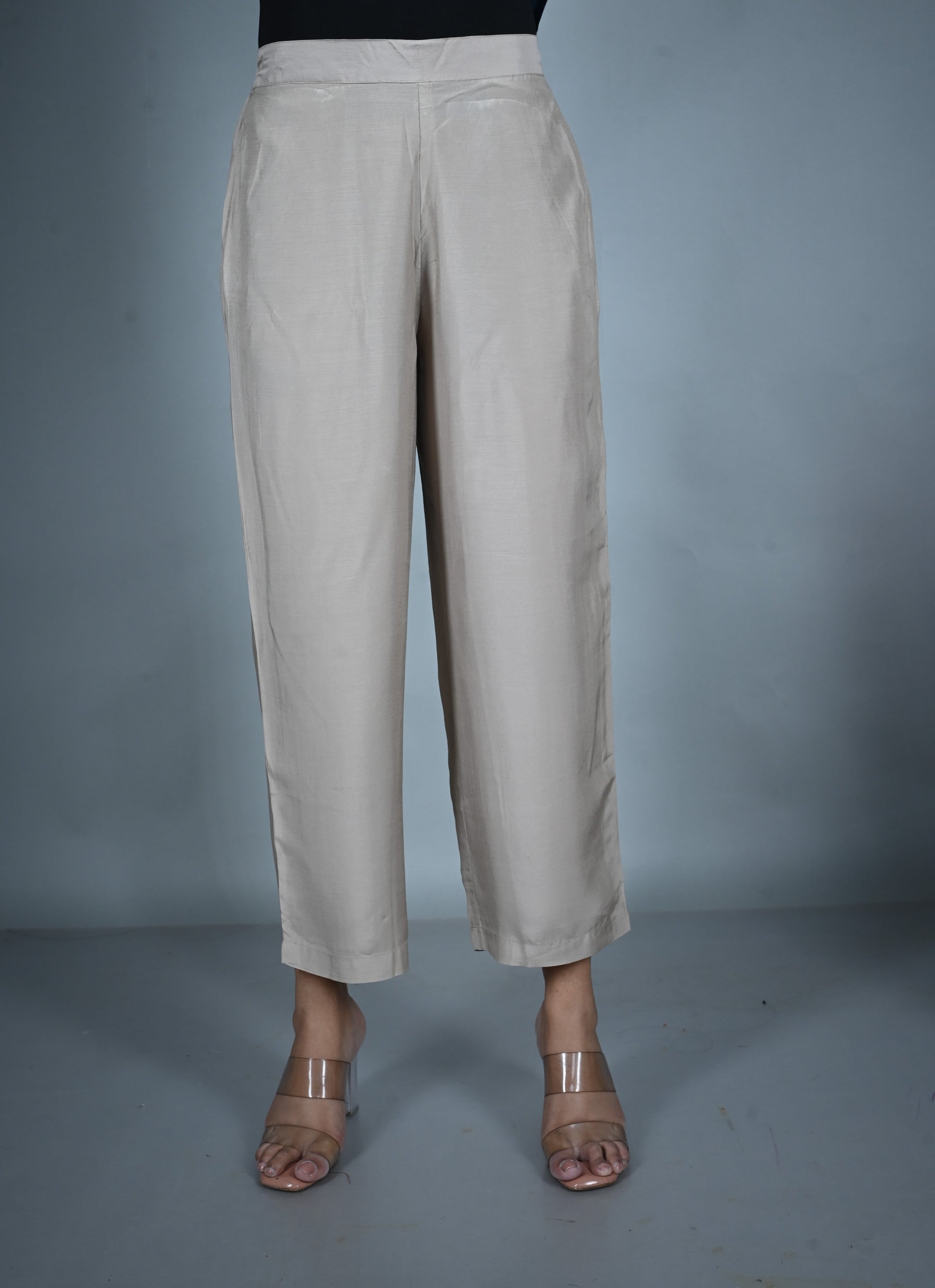 Purple Tassar A-Line Kurta with Leaf Hand Embroidery All over and Grey Silk Blend Pants Co-ord Set (set of 2)