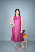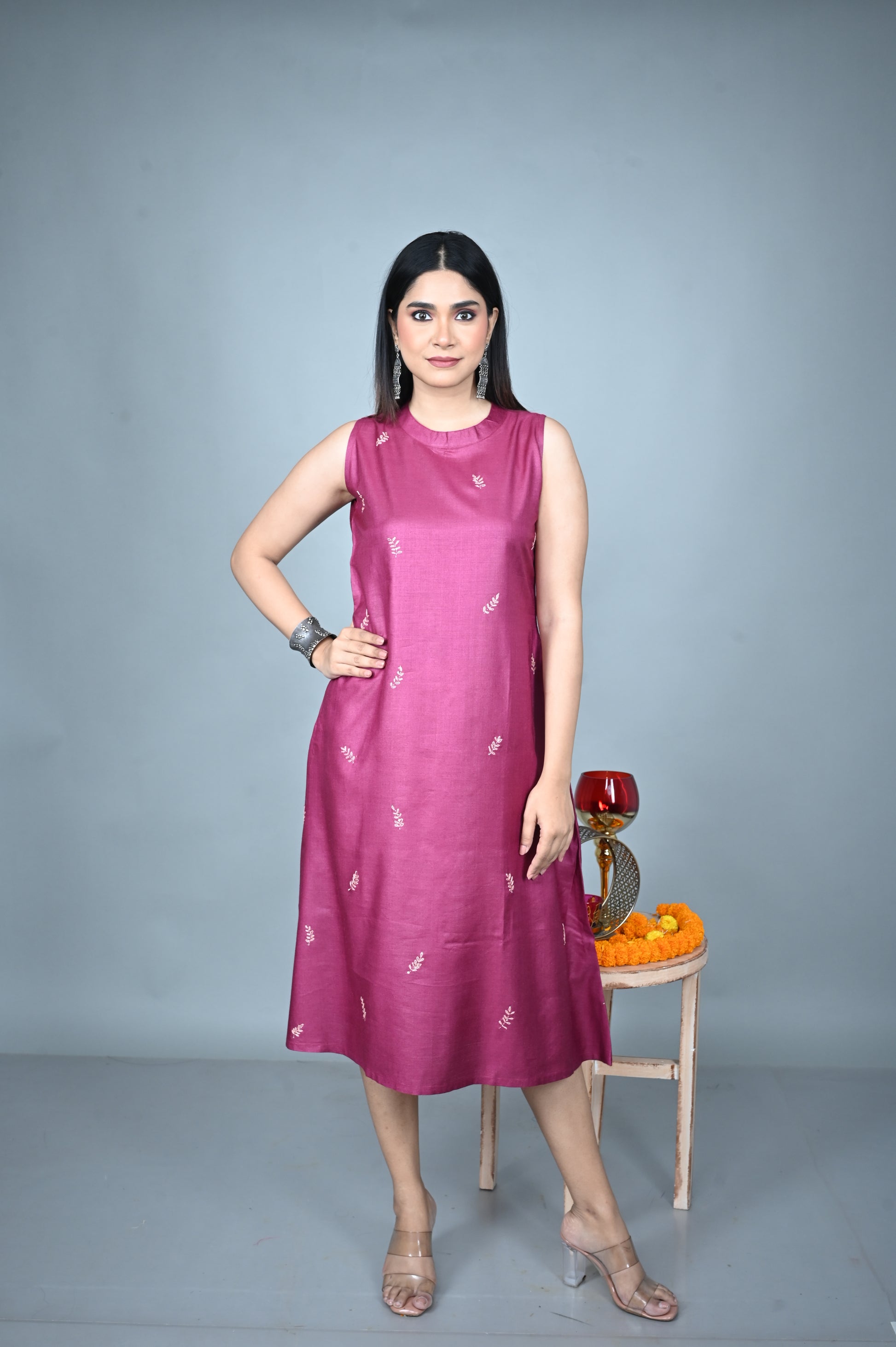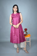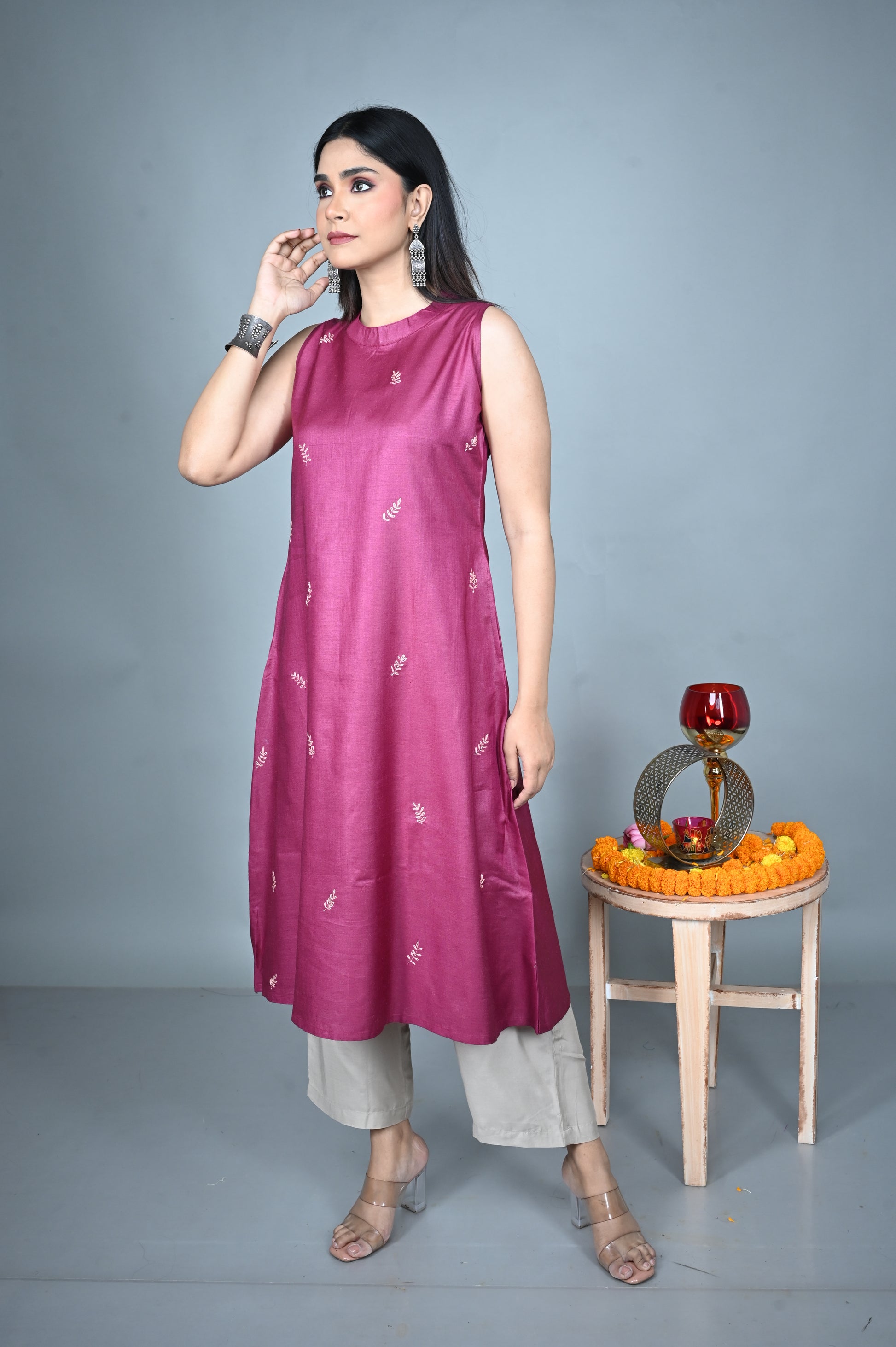 Crafted in sumptuous tussar silk, this purple kurta features a flattering A-line silhouette and a stylish halter neck. Adorned with delicate leaf-shaped hand embroidery all over, it brings artisanal charm to a contemporary design. Lightweight and elegant, this piece effortlessly balances festive vibrance with everyday wearability