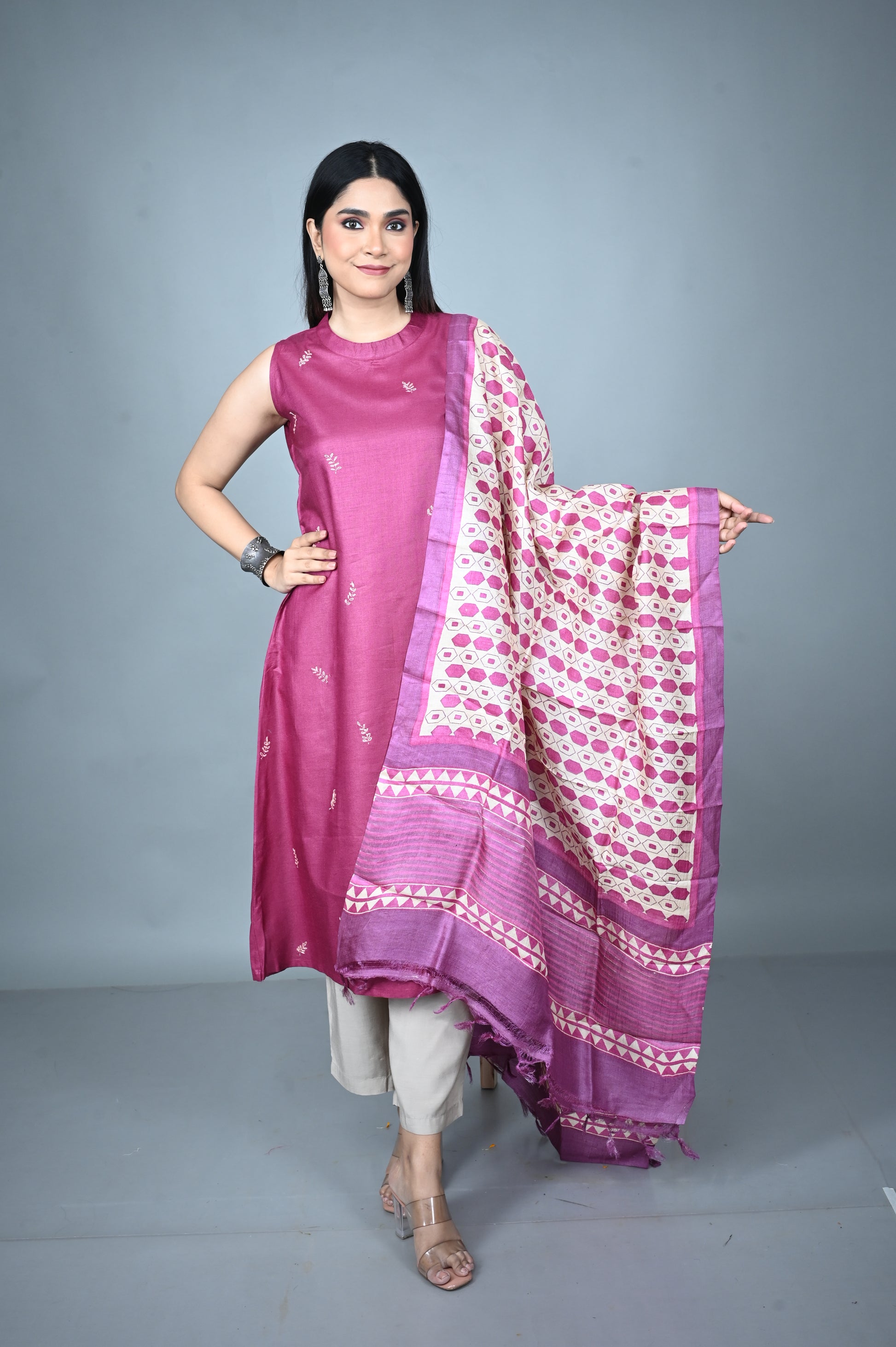 Pink-Purple Tassar Dupatta with Hand Block Printing