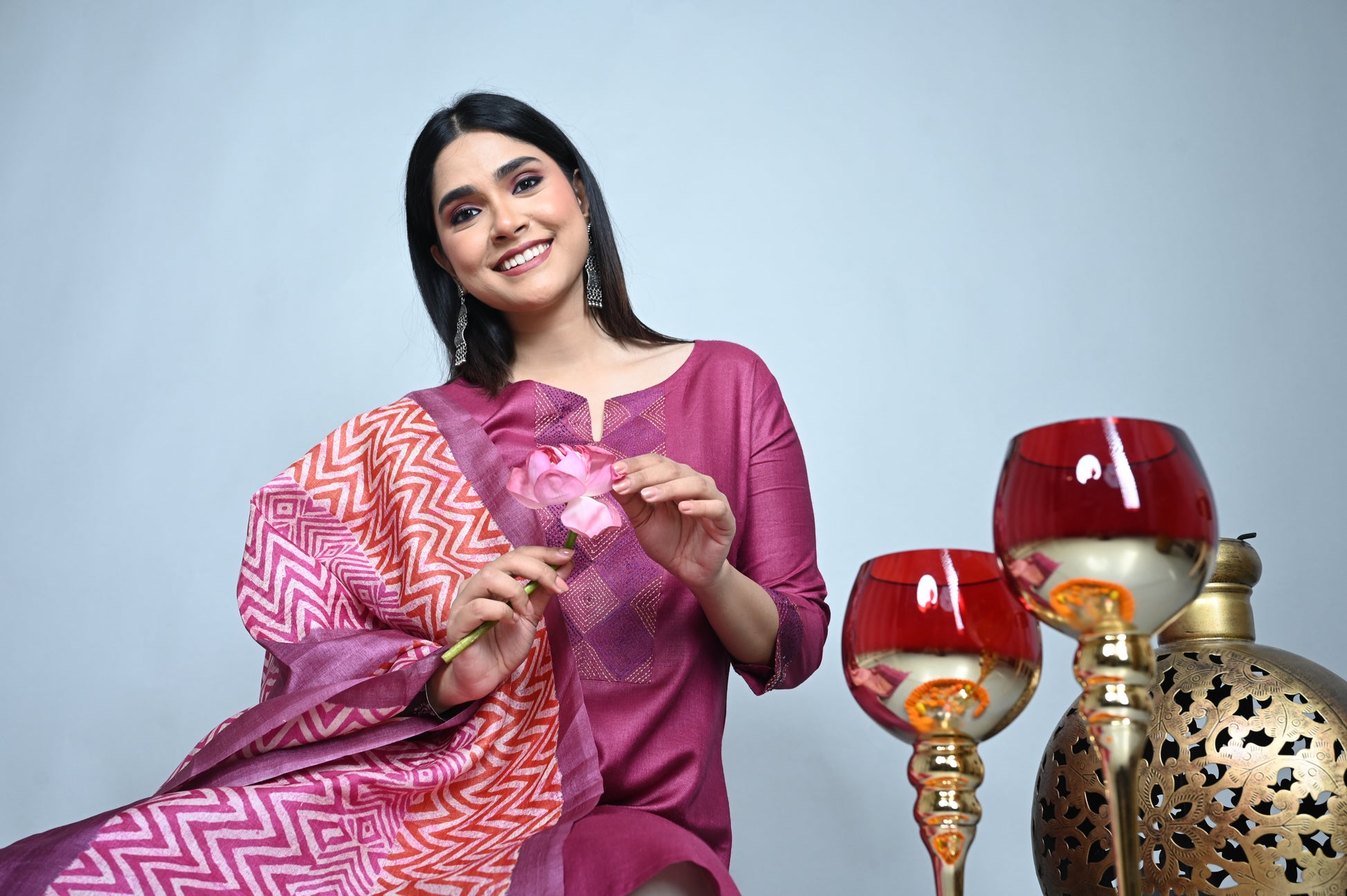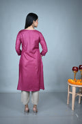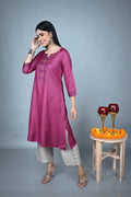 Crafted in lustrous tussar silk, this purple kurta exudes festive elegance. The straight silhouette is complemented by a graceful V-placket neckline, highlighted with delicate hand embroidery for a refined touch. Designed with three-quarter sleeves and side slits for ease of movement, this kurta strikes the perfect balance between tradition and modern sophistication — ideal for celebratory gatherings or elegant evenings