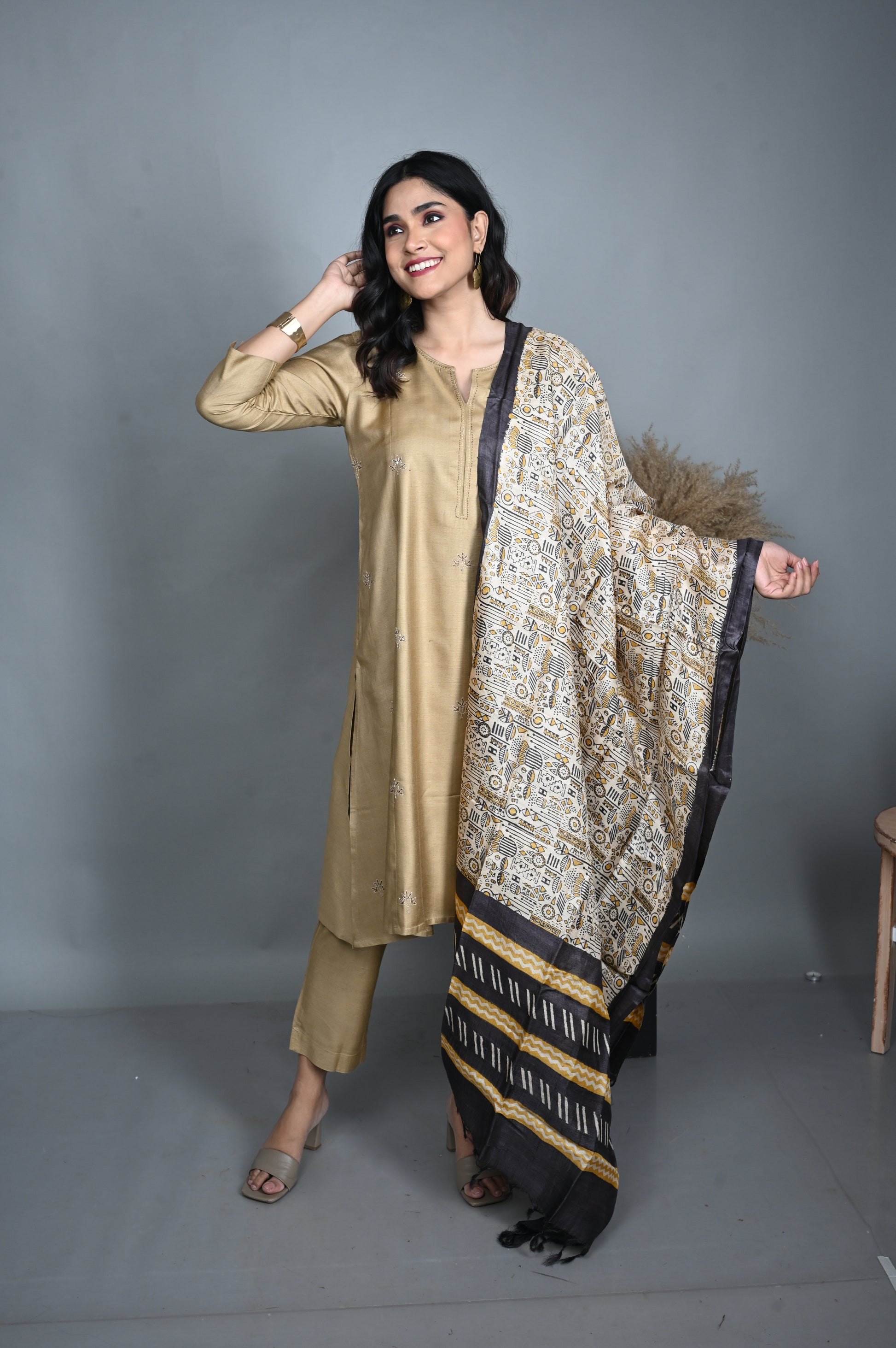 Crafted from rich silk slub fabric, these gold pants offer a luxurious yet comfortable fit. Designed for effortless styling, they pair beautifully with a variety of kurtas and tunics, adding a touch of understated elegance to both festive and everyday looks