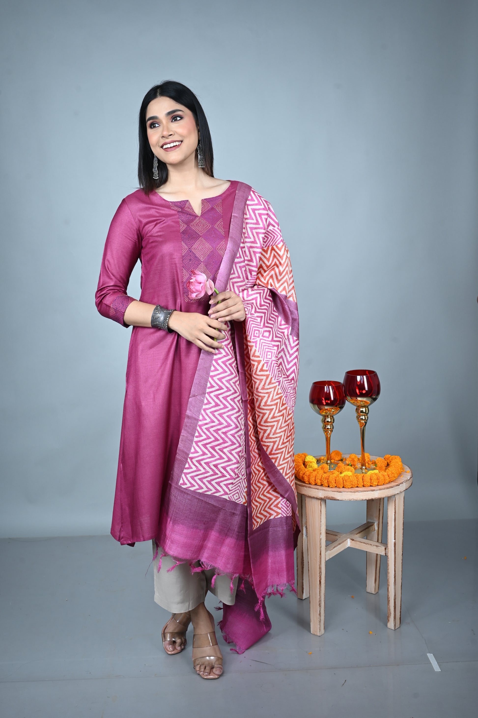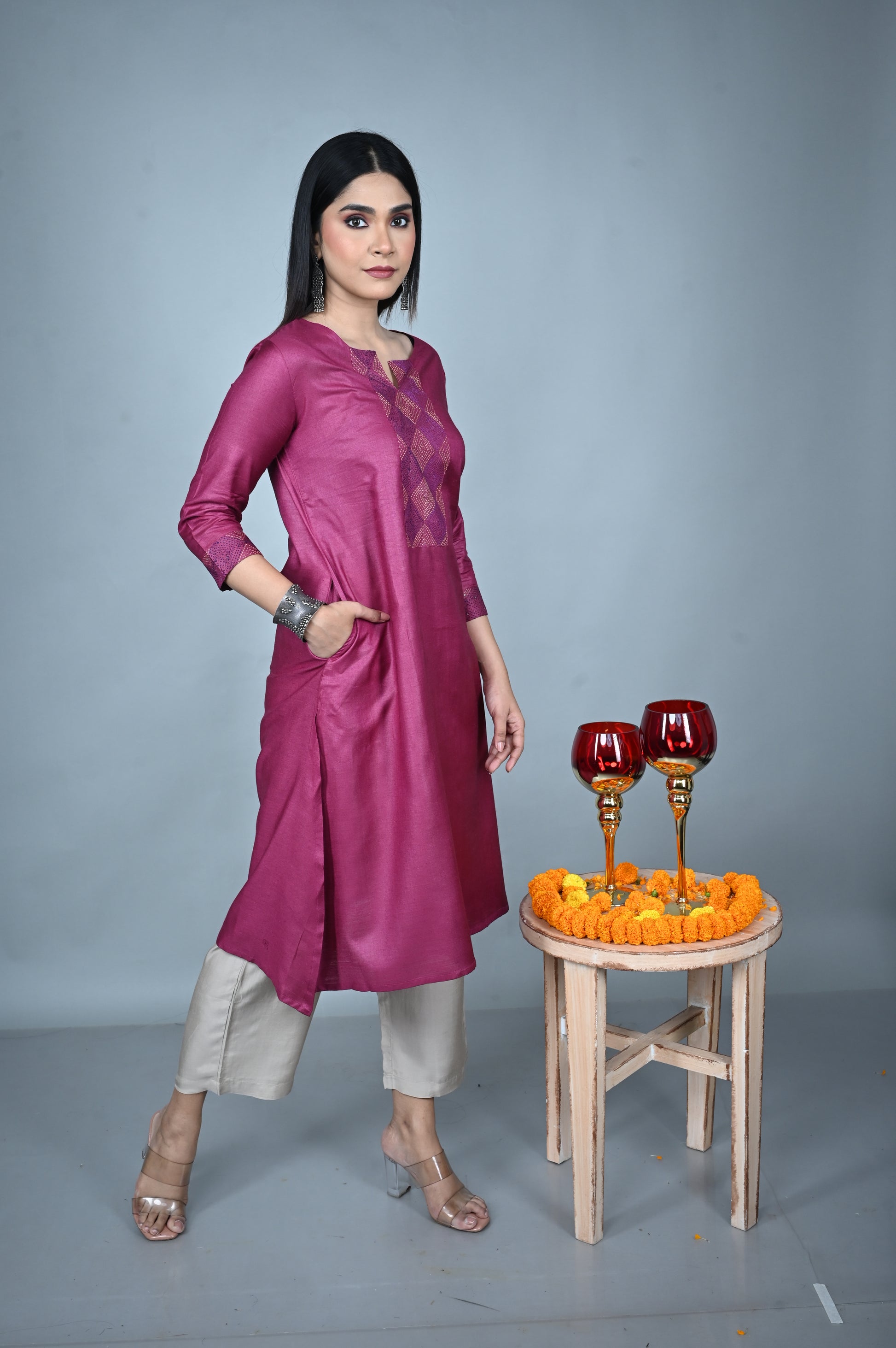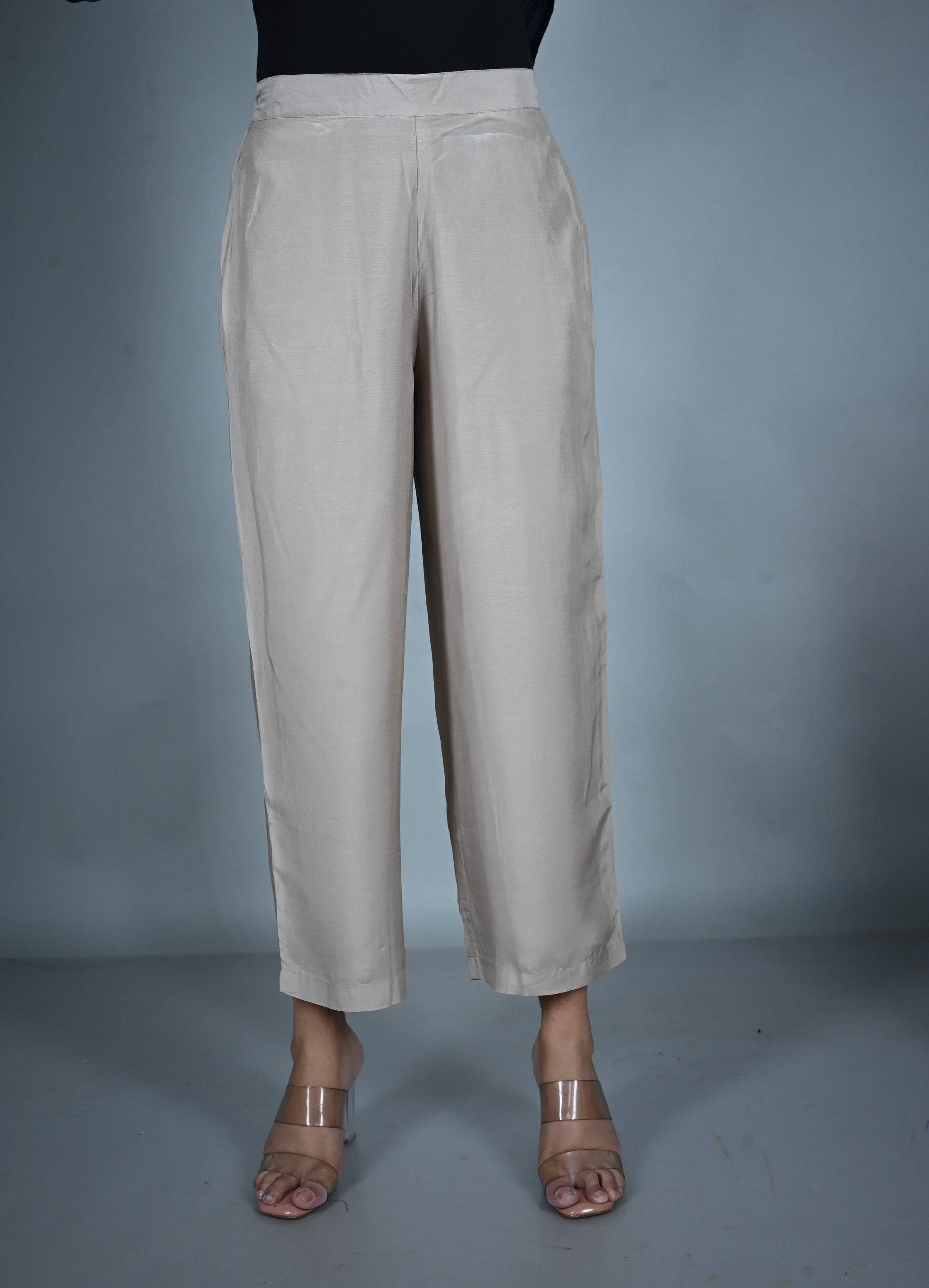 Crafted in a soft silk blend, these grey pants are designed for comfort with a touch of elegance. The straight-fit silhouette drapes beautifully, while the subtle sheen of the fabric adds sophistication. Finished with practical side pockets, these versatile pants pair seamlessly with kurtas, tunics, or dupattas β making them an effortless choice for both everyday wear and festive occasions.