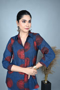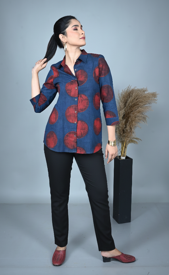 Handcrafted in pure cotton, this shirt celebrates the timeless art of Ajrakh block printing β an ancient craft known for its intricate motifs and rich natural hues. The deep indigo base is adorned with bold circular red Ajrakh patterns, creating a striking blend of tradition and modernity.