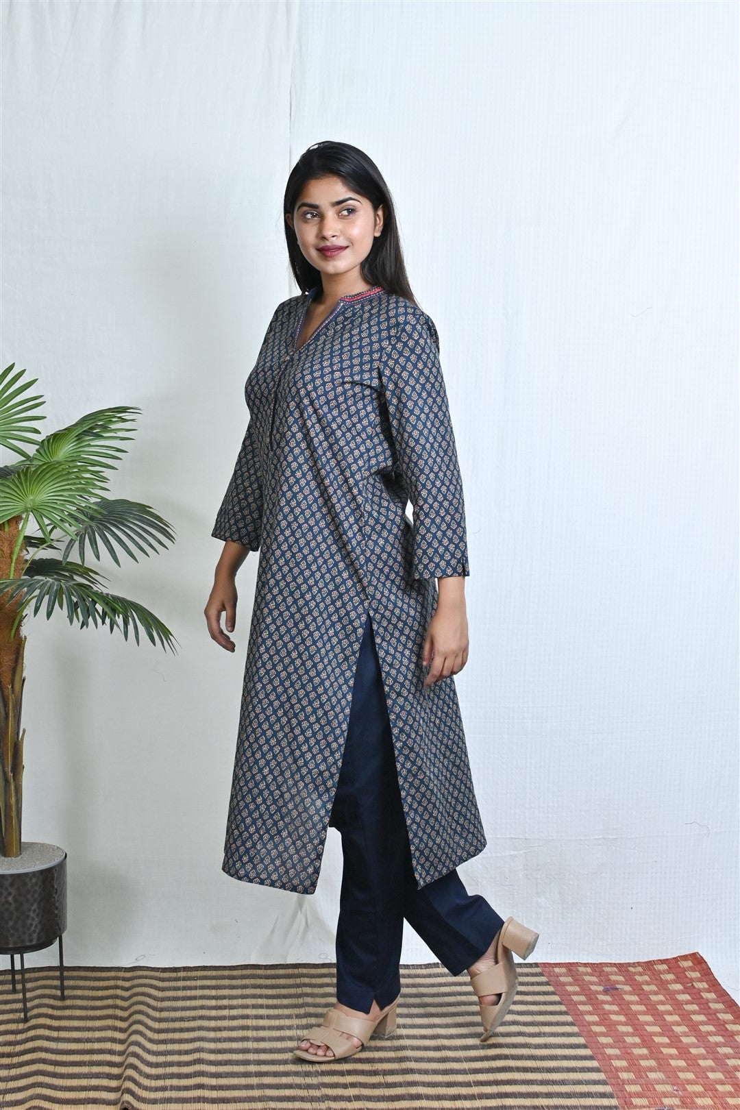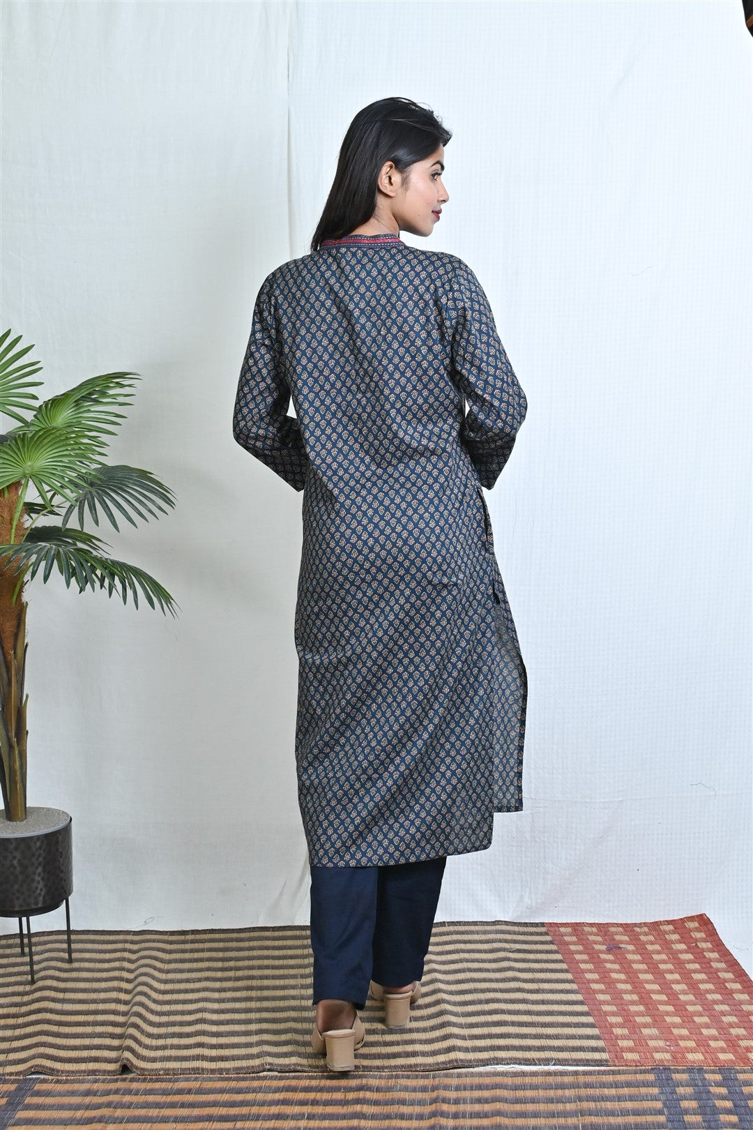Indigo Ajrakh Printed Straight Kurta with Hand Embroidery Detailing