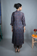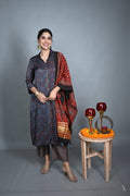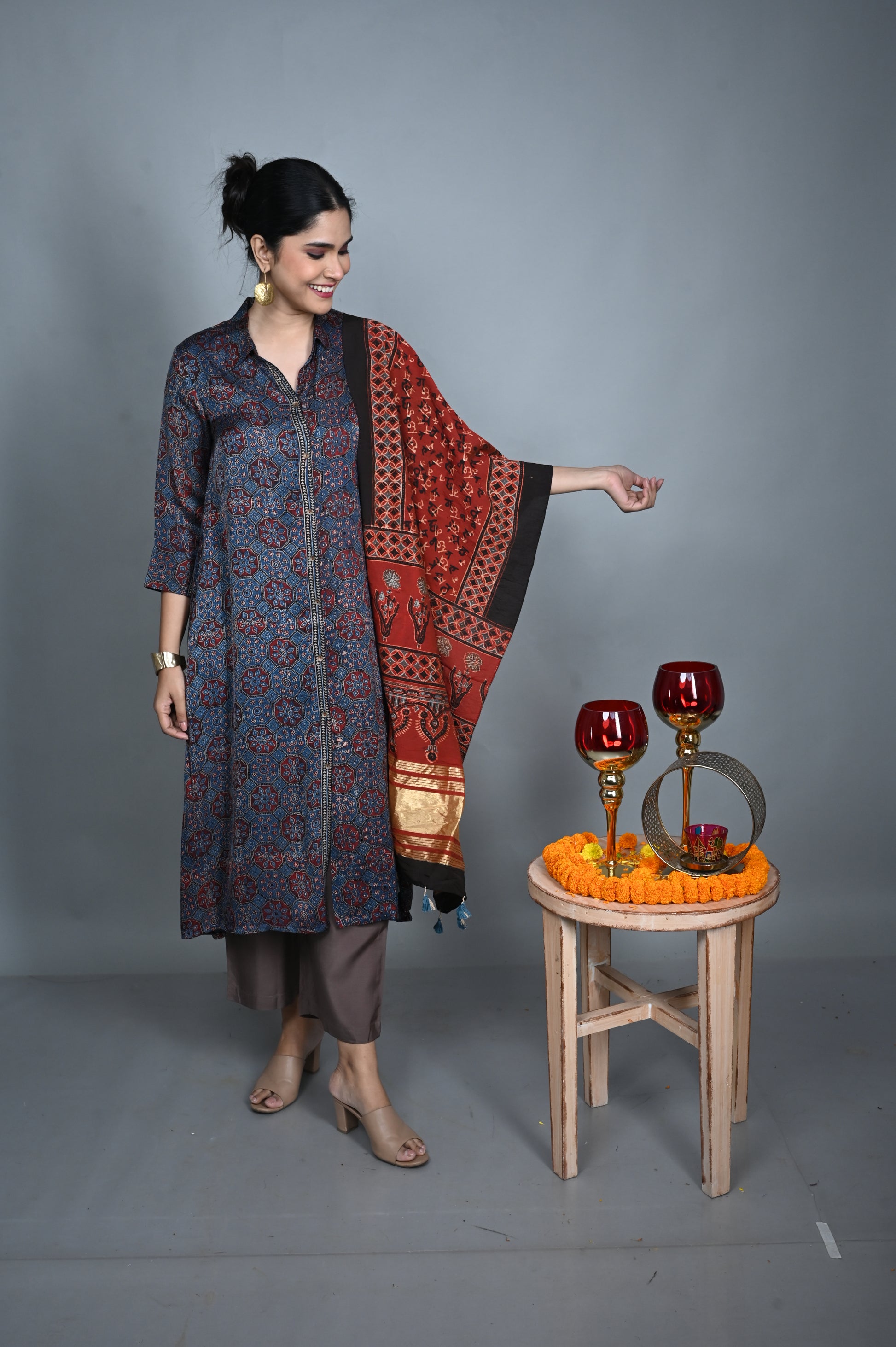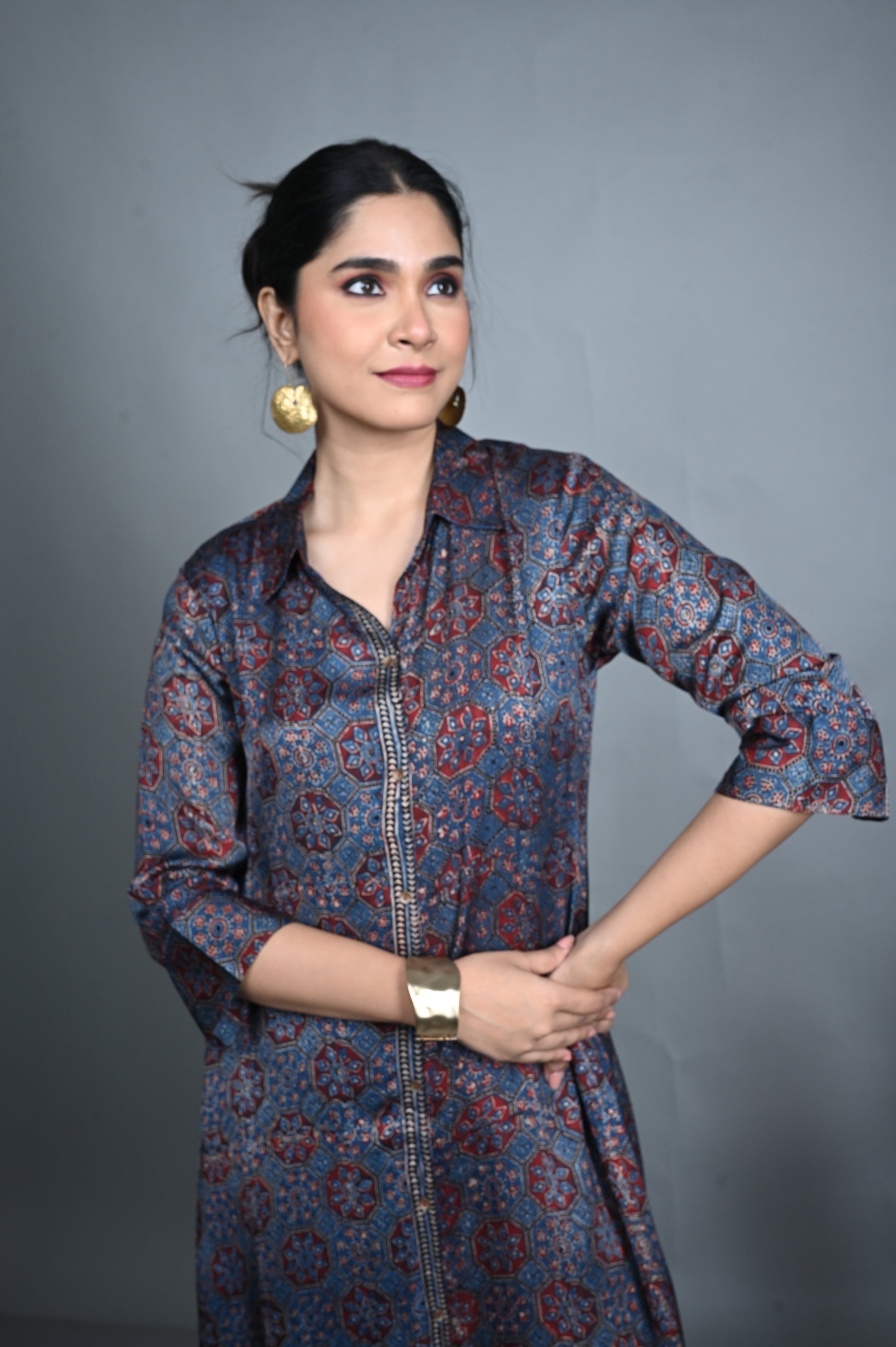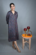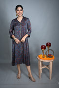 This indigo modal silk dress features a classic shirt collar and intricate motif detailing subtly highlighted with red accents. Designed for a flowing yet structured silhouette, it blends modern elegance with artisanal charm β ideal for festive celebrations or effortless everyday sophistication