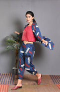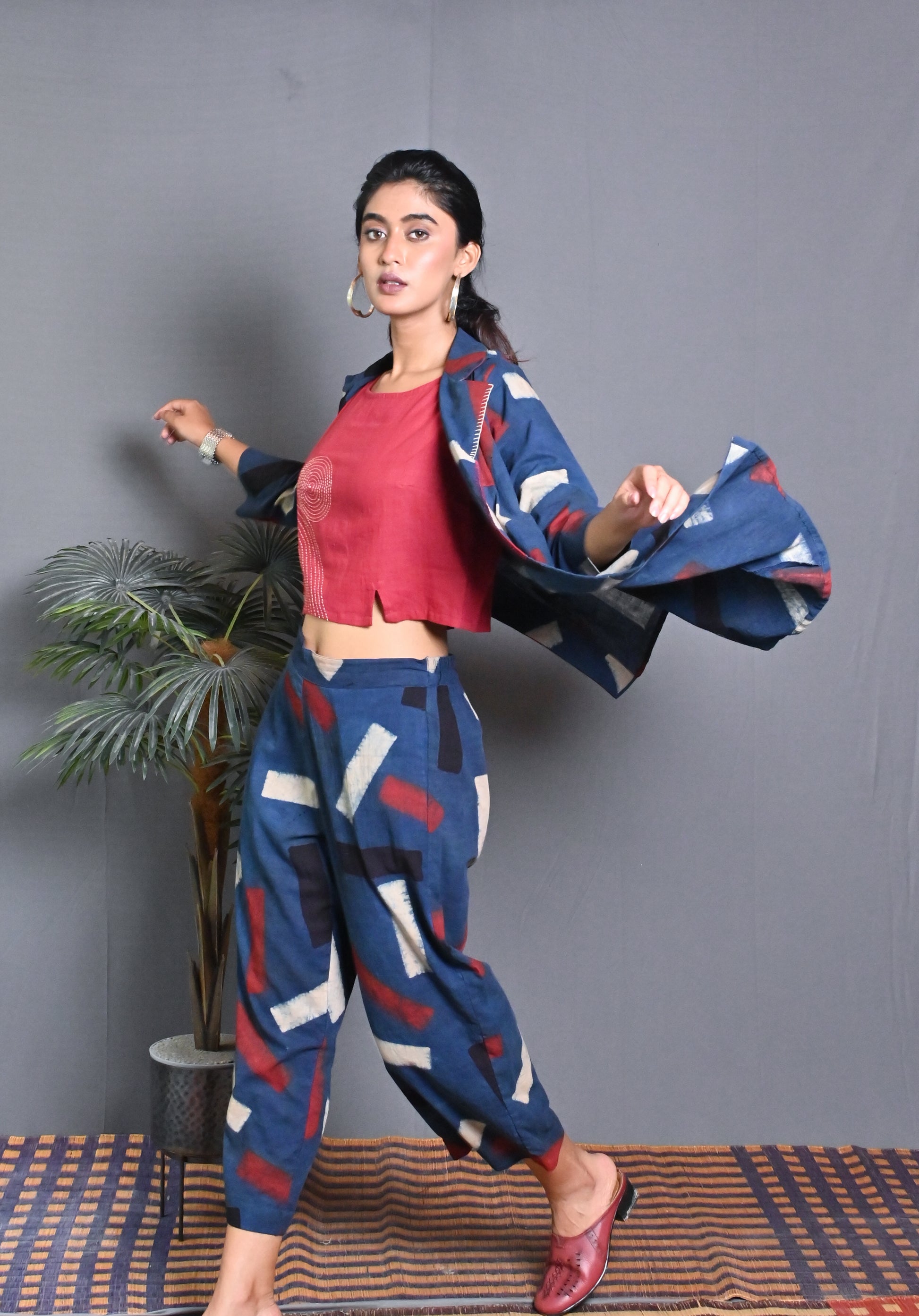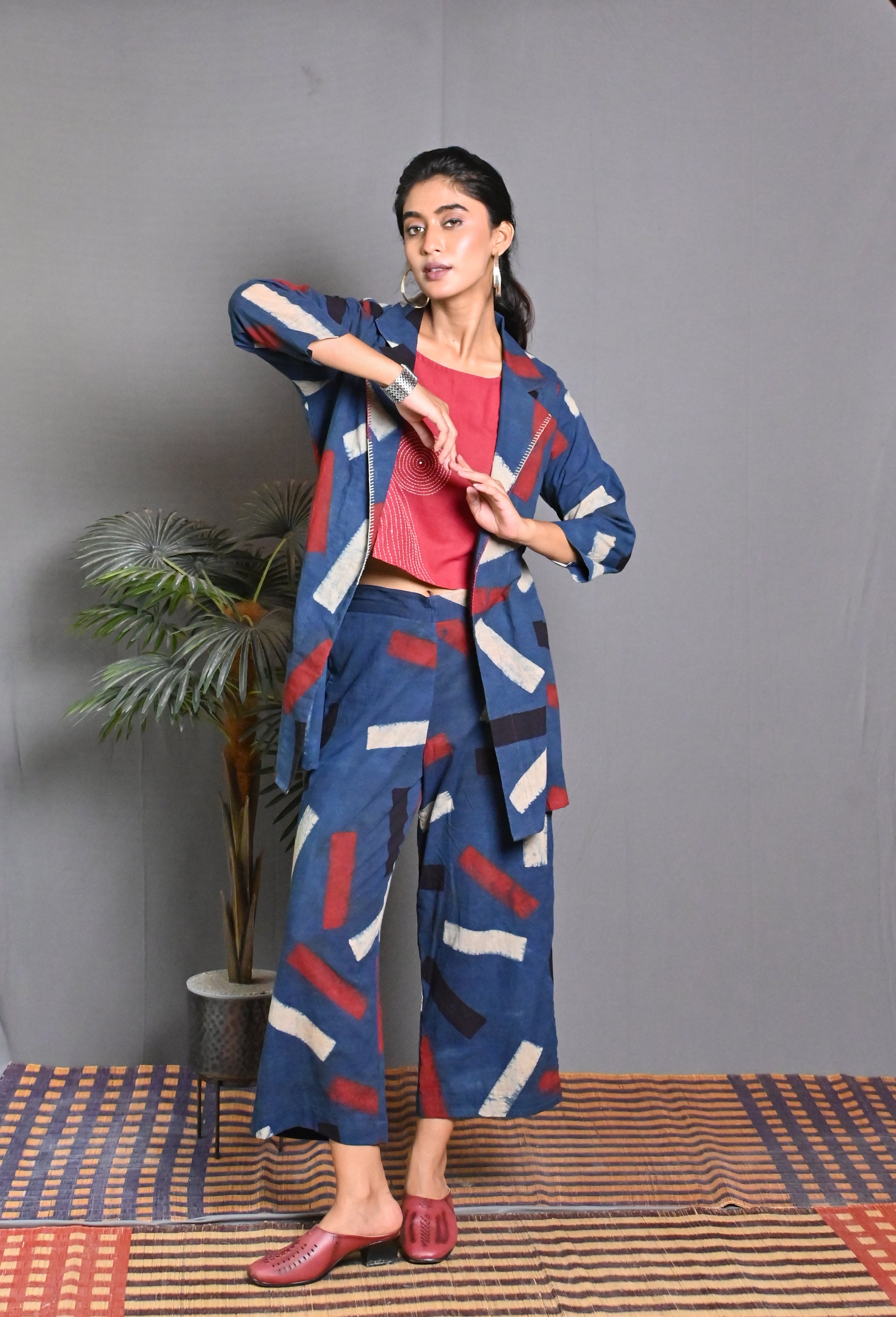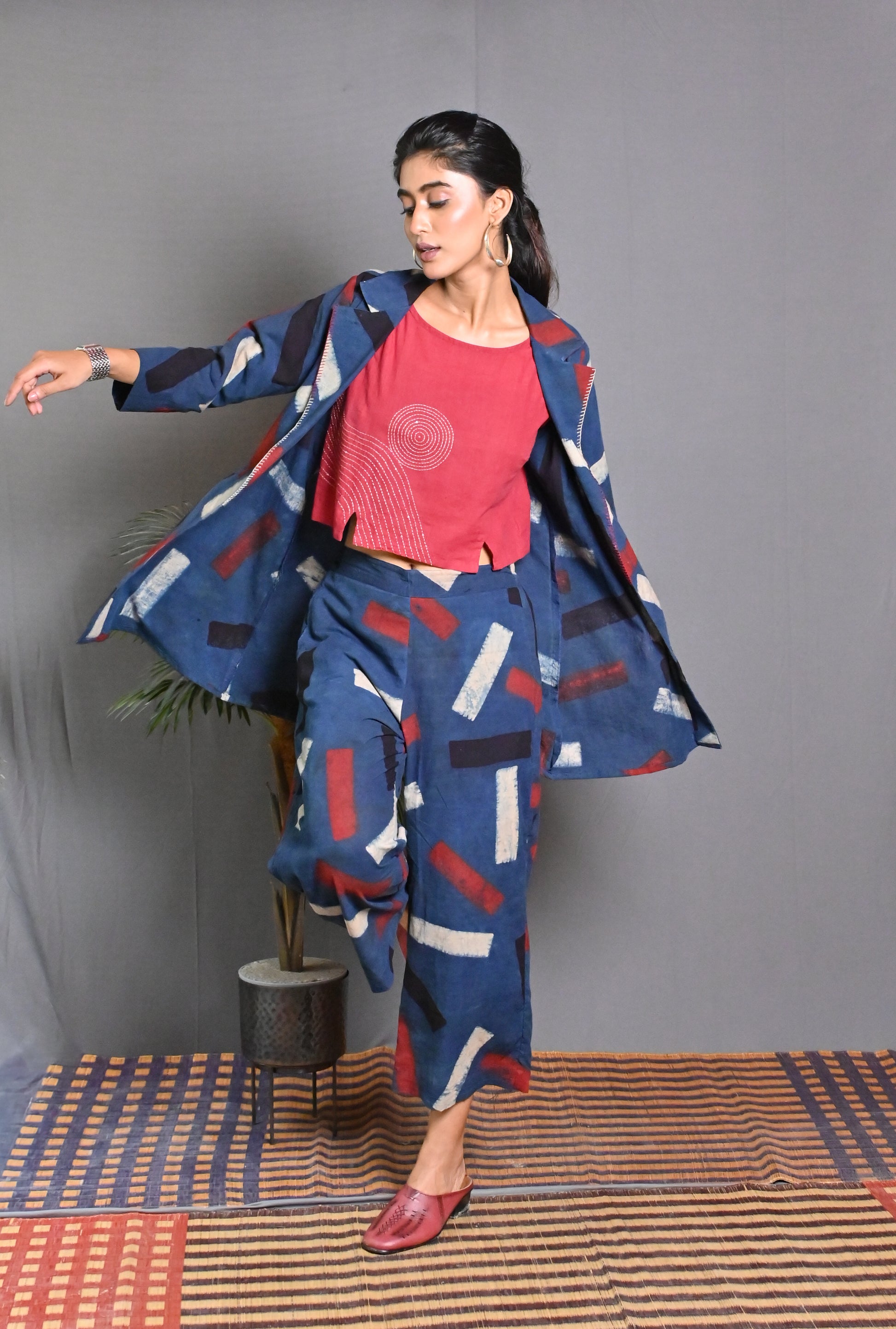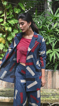 Enhance your style with the Indigo Overlay Jacket with Kantha Hand Embroidery, a perfect fusion of contemporary and traditional design. The intricate Kantha embroidery adds a unique touch to this versatile piece, ideal for layering over any outfit.