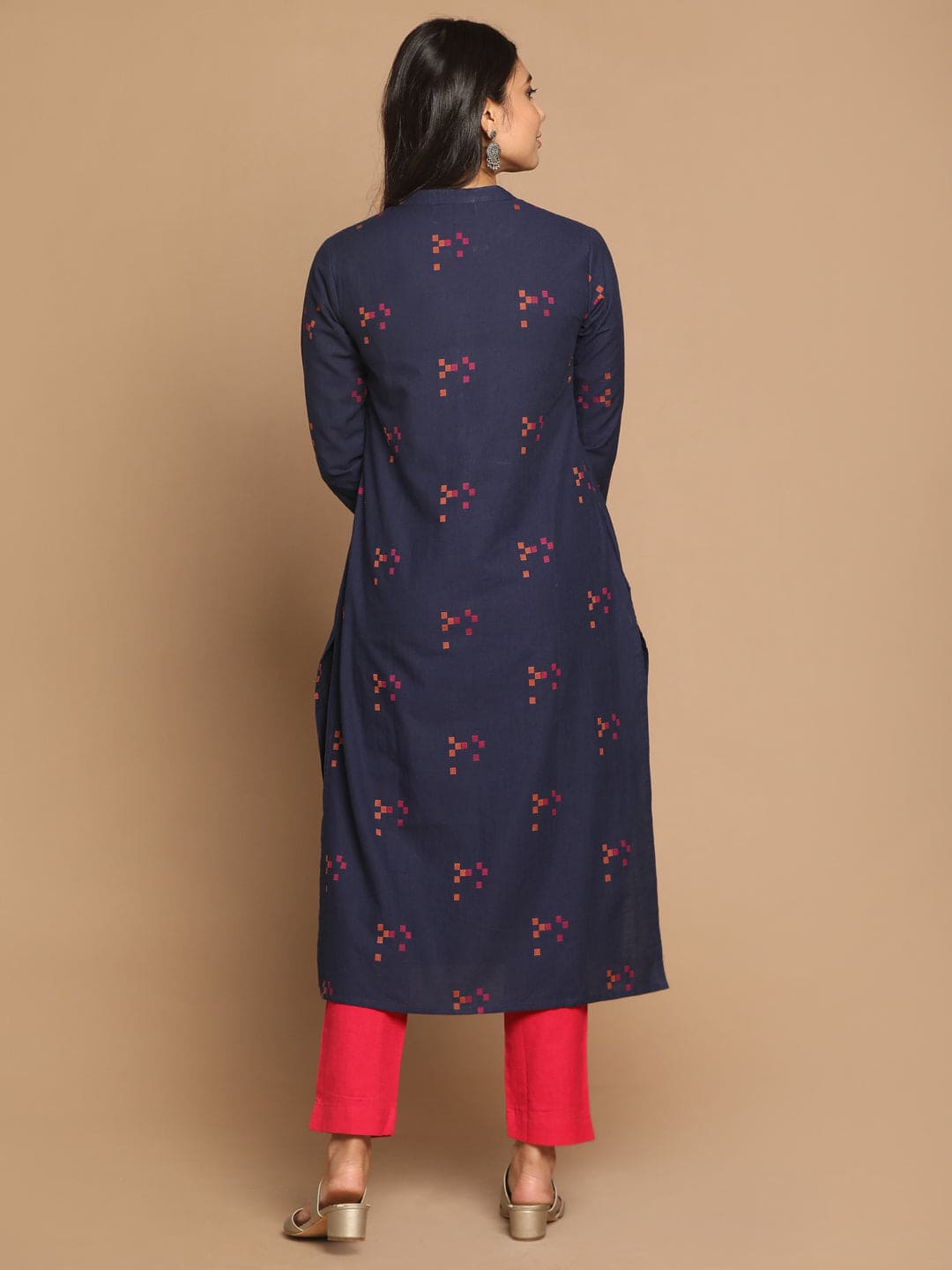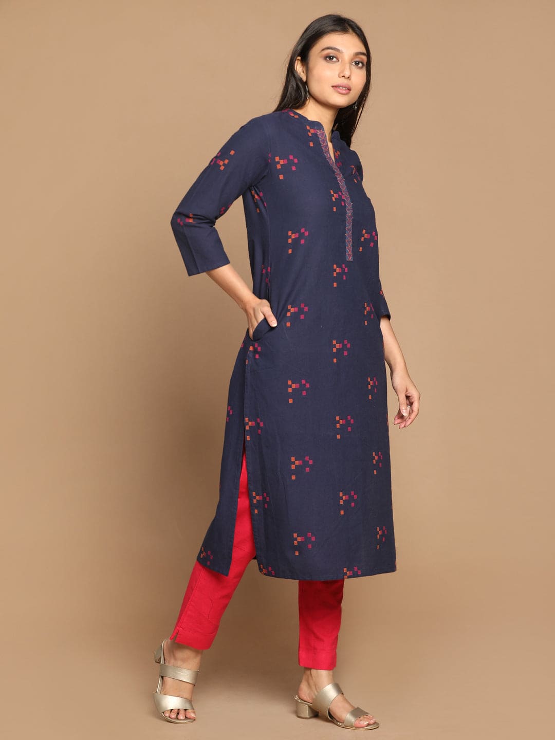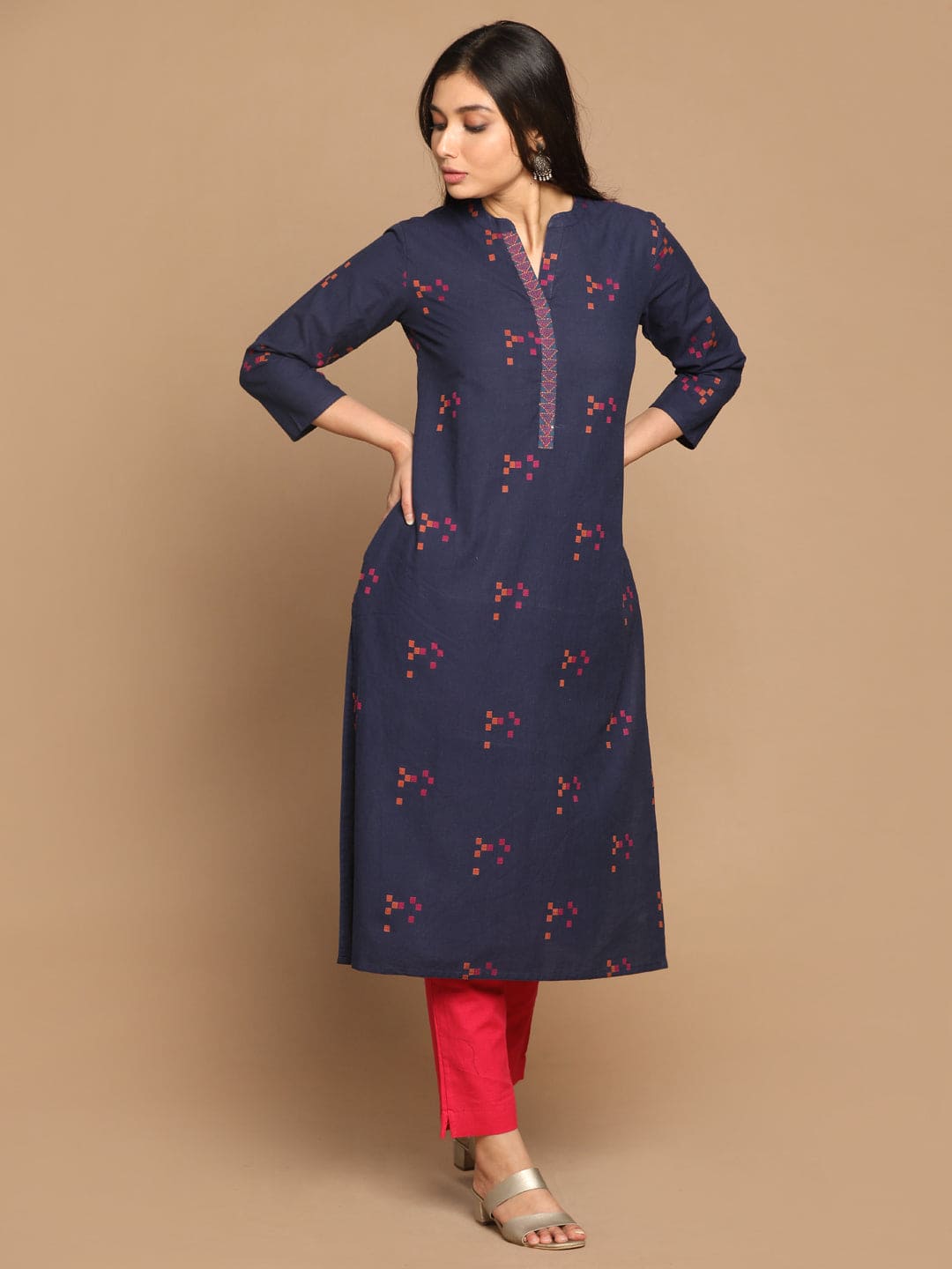 Indigo-Pink Straight Fit Cotton Kurta with Hand Embroidery Triangles